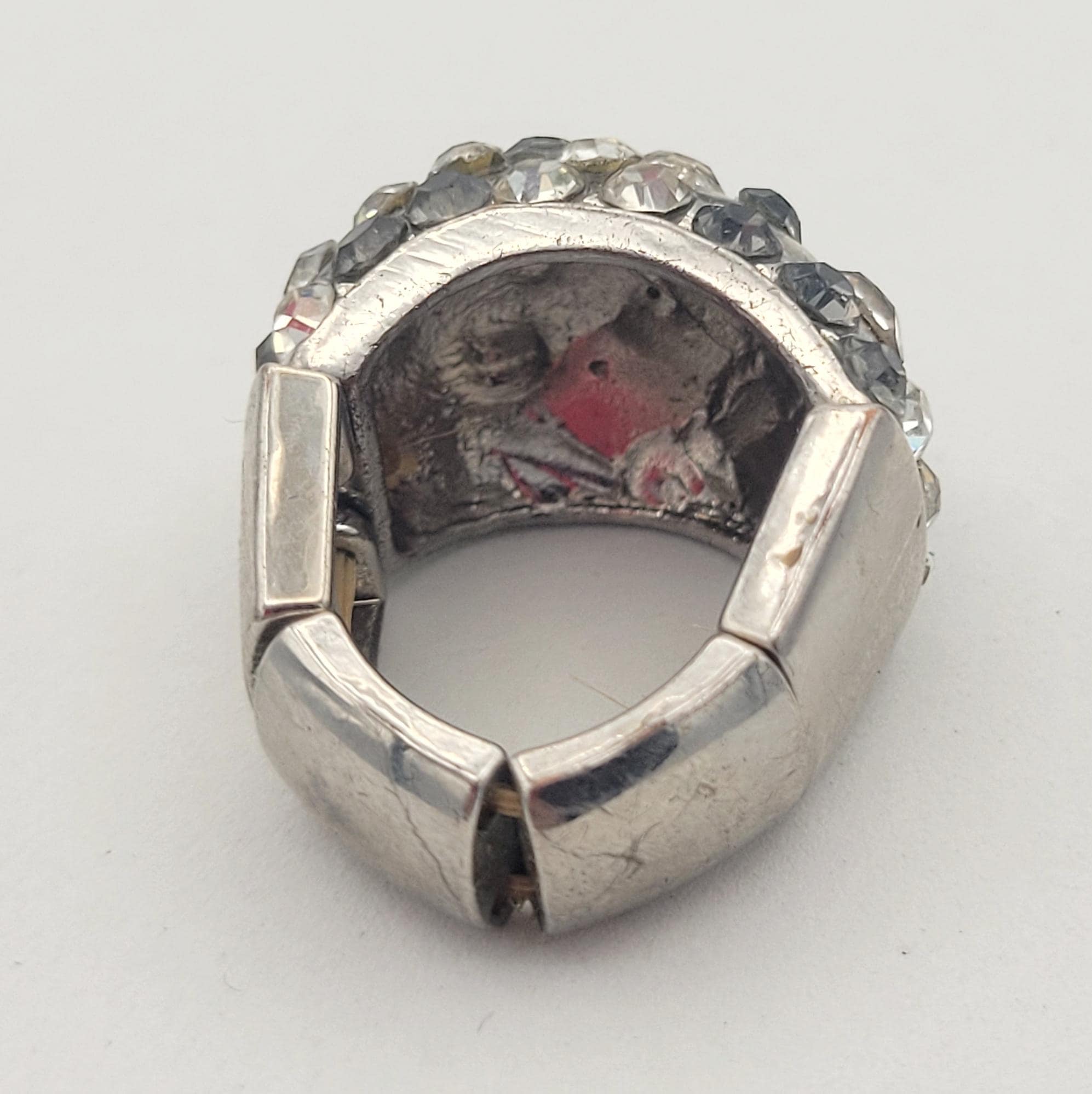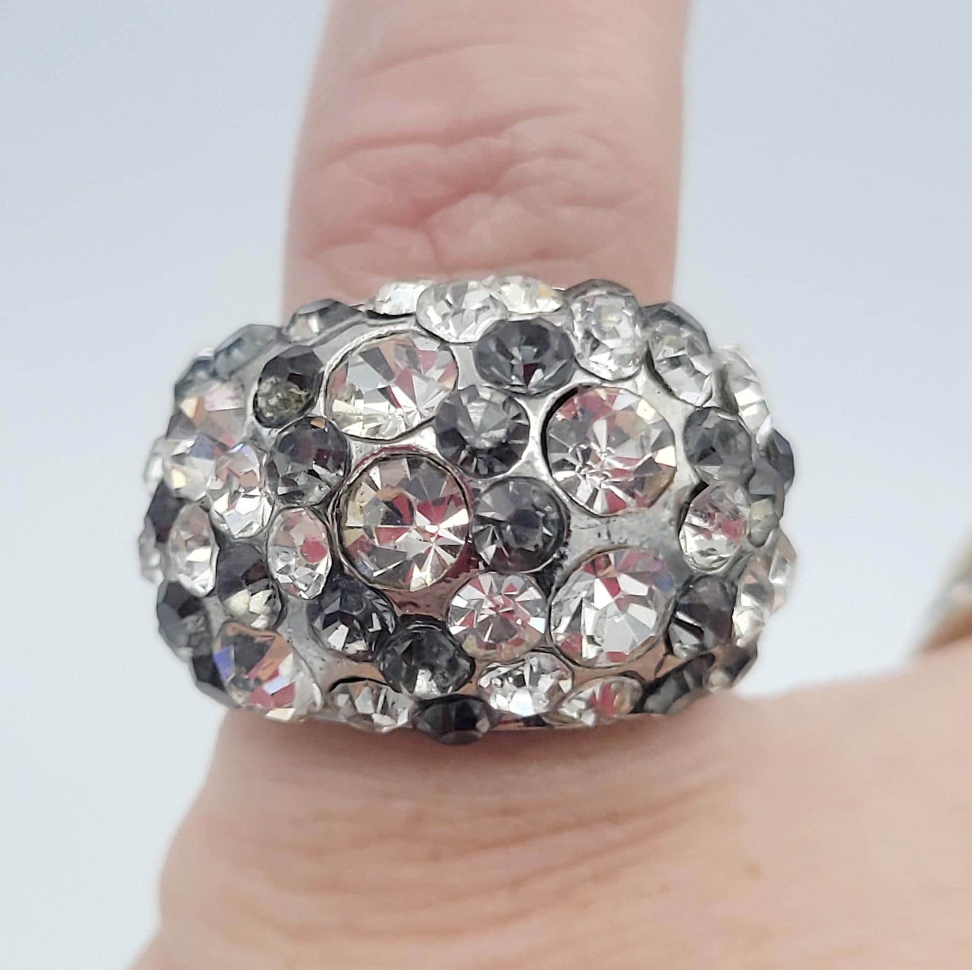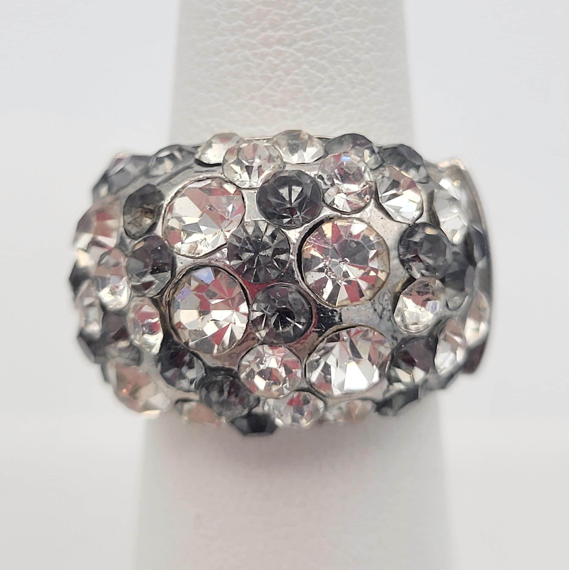 Vintage Oversize Silver Tone Stretch Cocktail Ring Encrusted with Clear & Gray Round Faceted Rhinestones