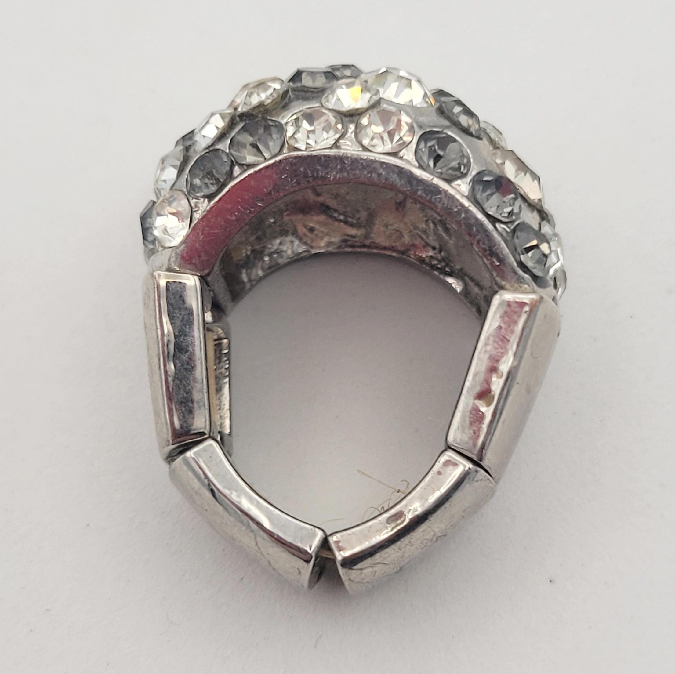 This sparkling ring is sure to get noticed! The silver-tone band stretches to adjust for fit. The face of the ring is encrusted with clear & gray round faceted rhinestones in various sizes. This piece is in excellent vintage condition with very little wear.