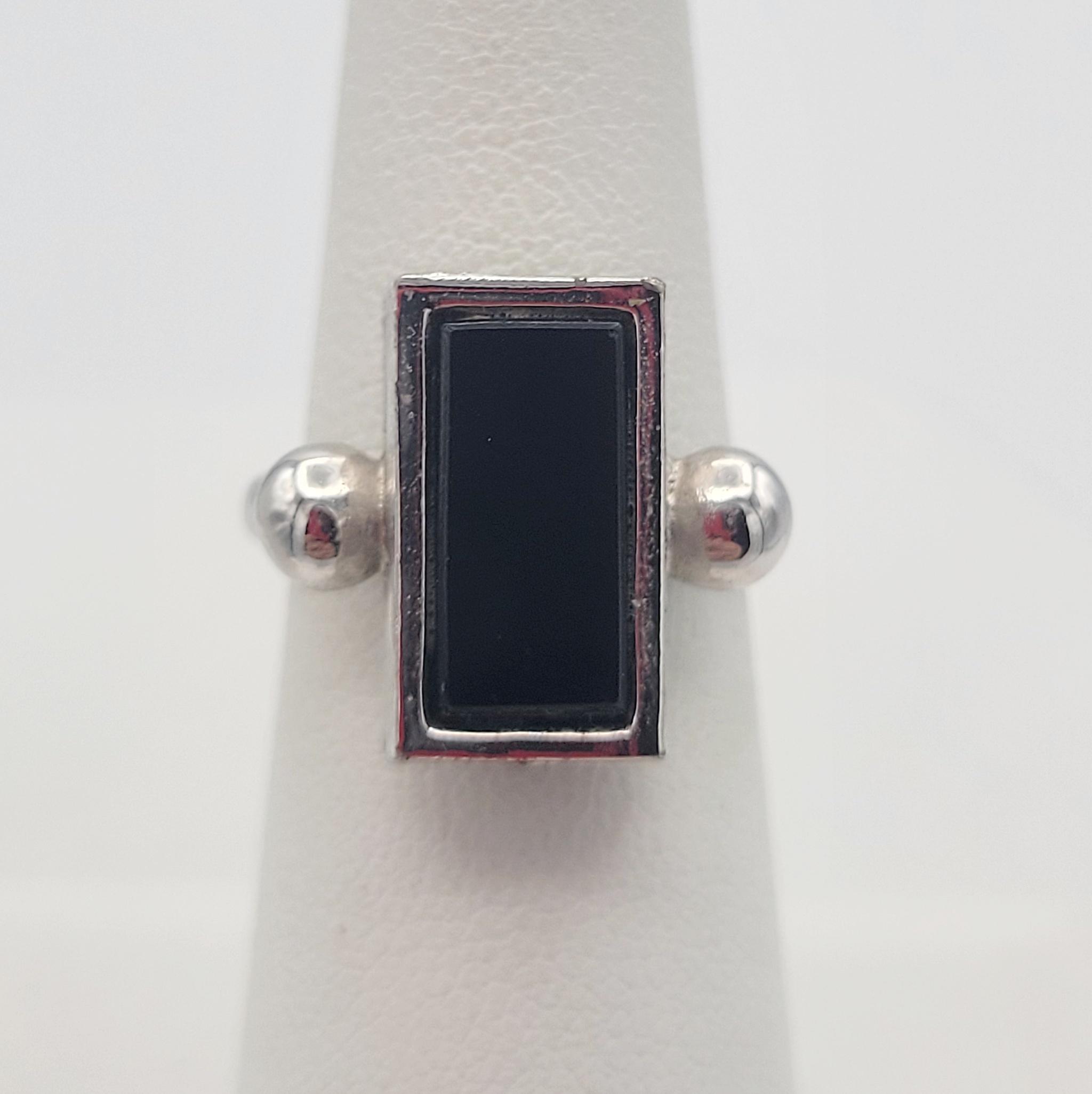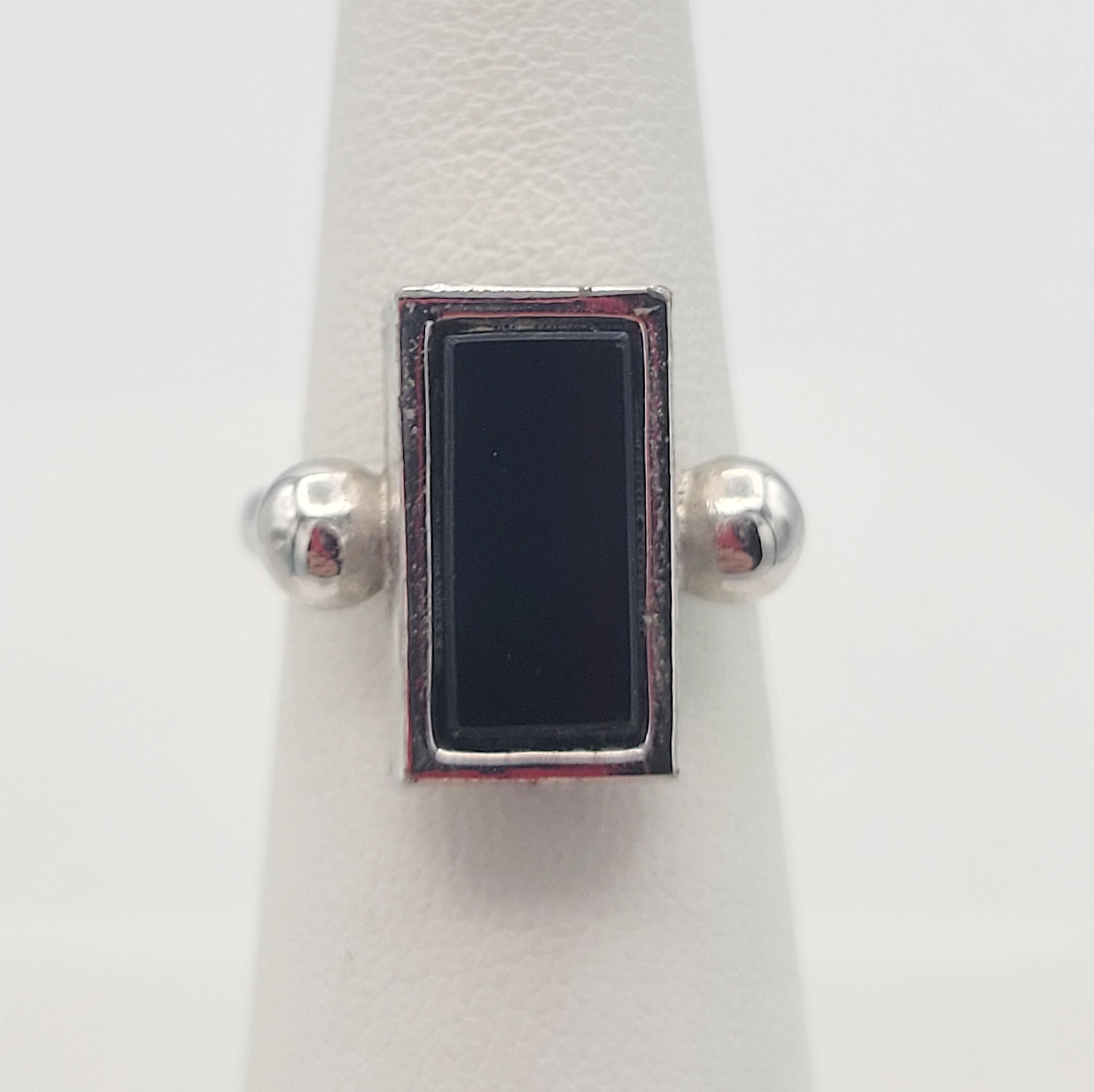 This versatile ring will become a favorite in your jewelry wardrobe! The silver-tone adjustable band is affixed to a silver-tone rectangular-shaped setting with 2 chrome sphere accents. The edges of the rectangular setting are textured & the setting features a large rectangular faux black onyx cabochon. This ring is in excellent, nearly new condition.