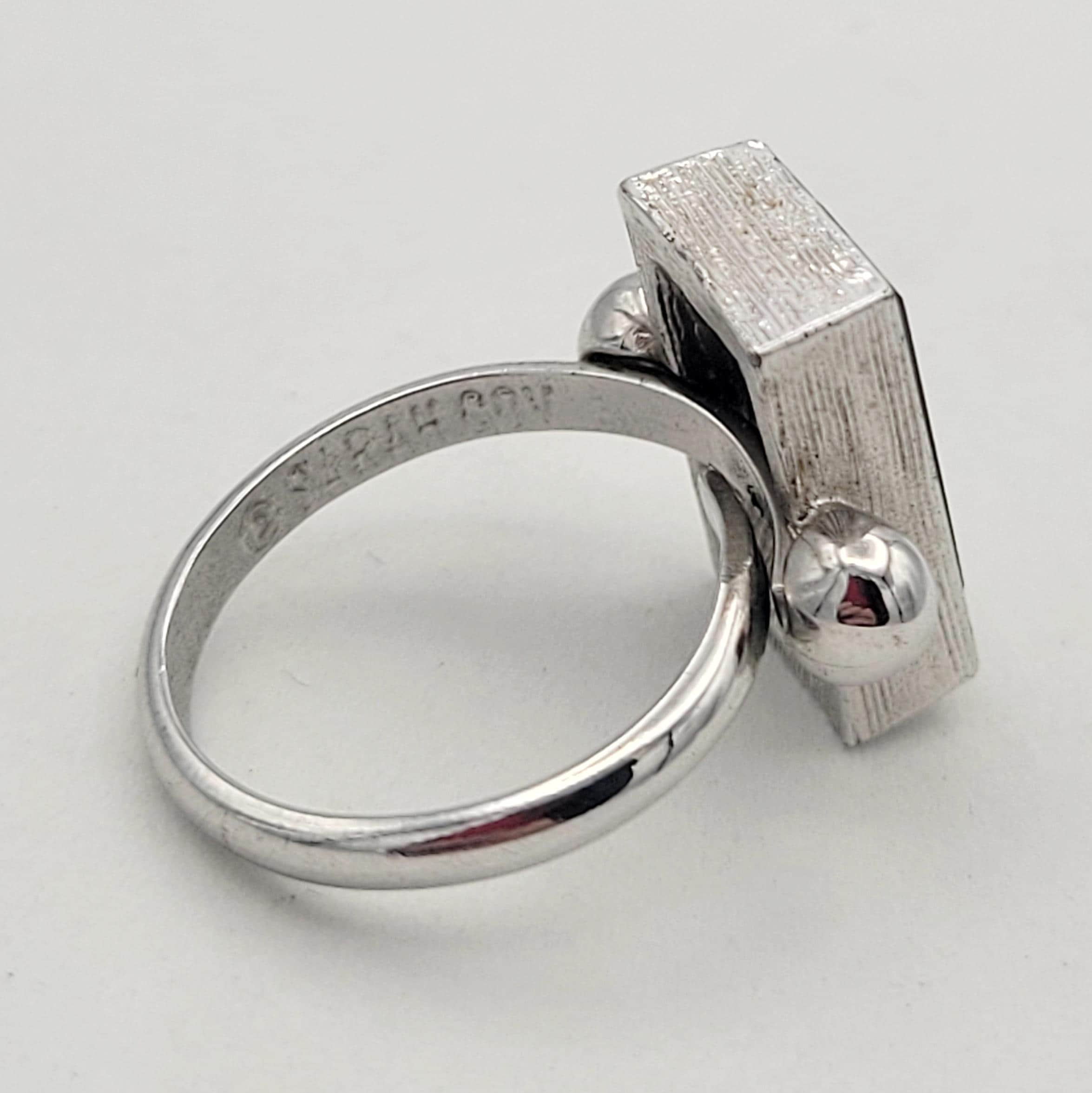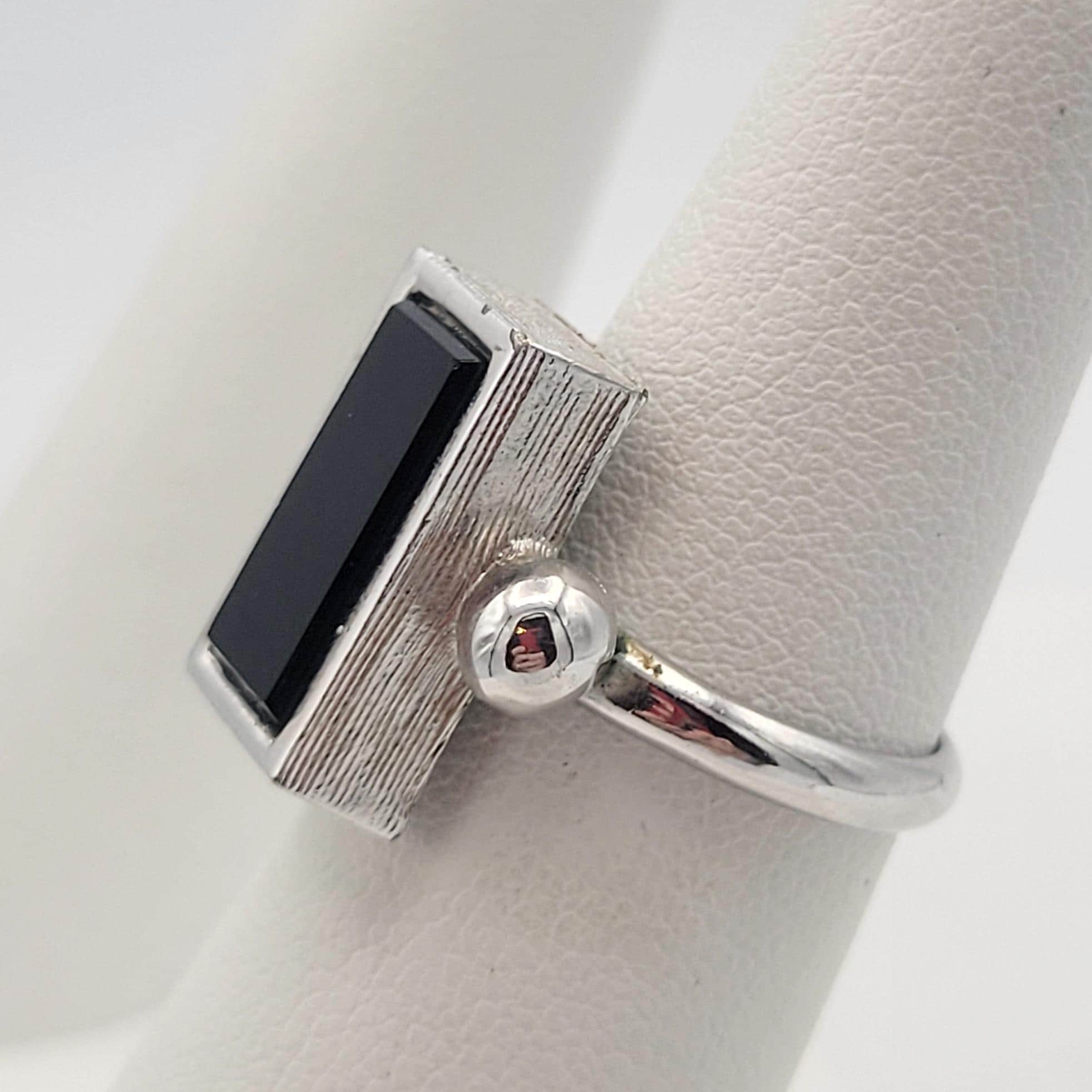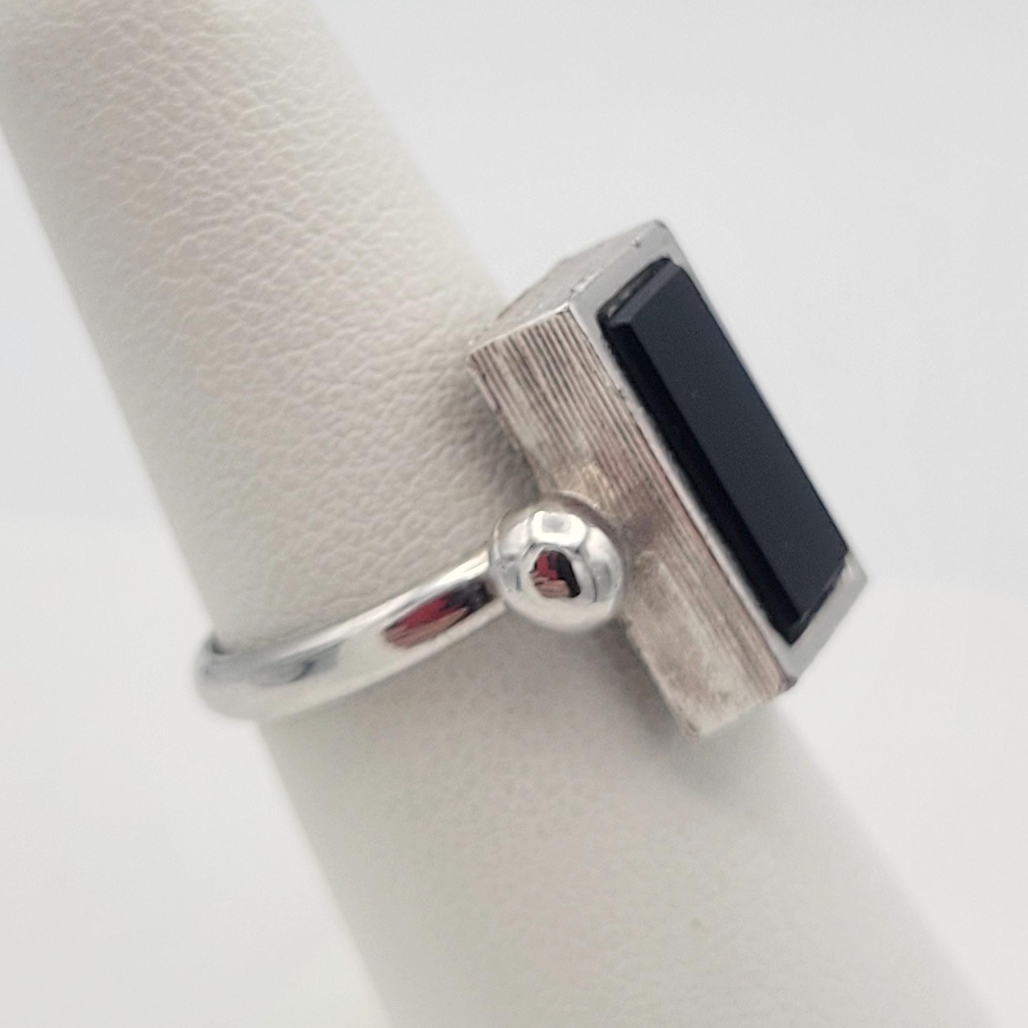 Vintage 1970s Sarah Coventry Ingrid Ring Silver Tone with Faux Black Onyx Rectangular Stone
