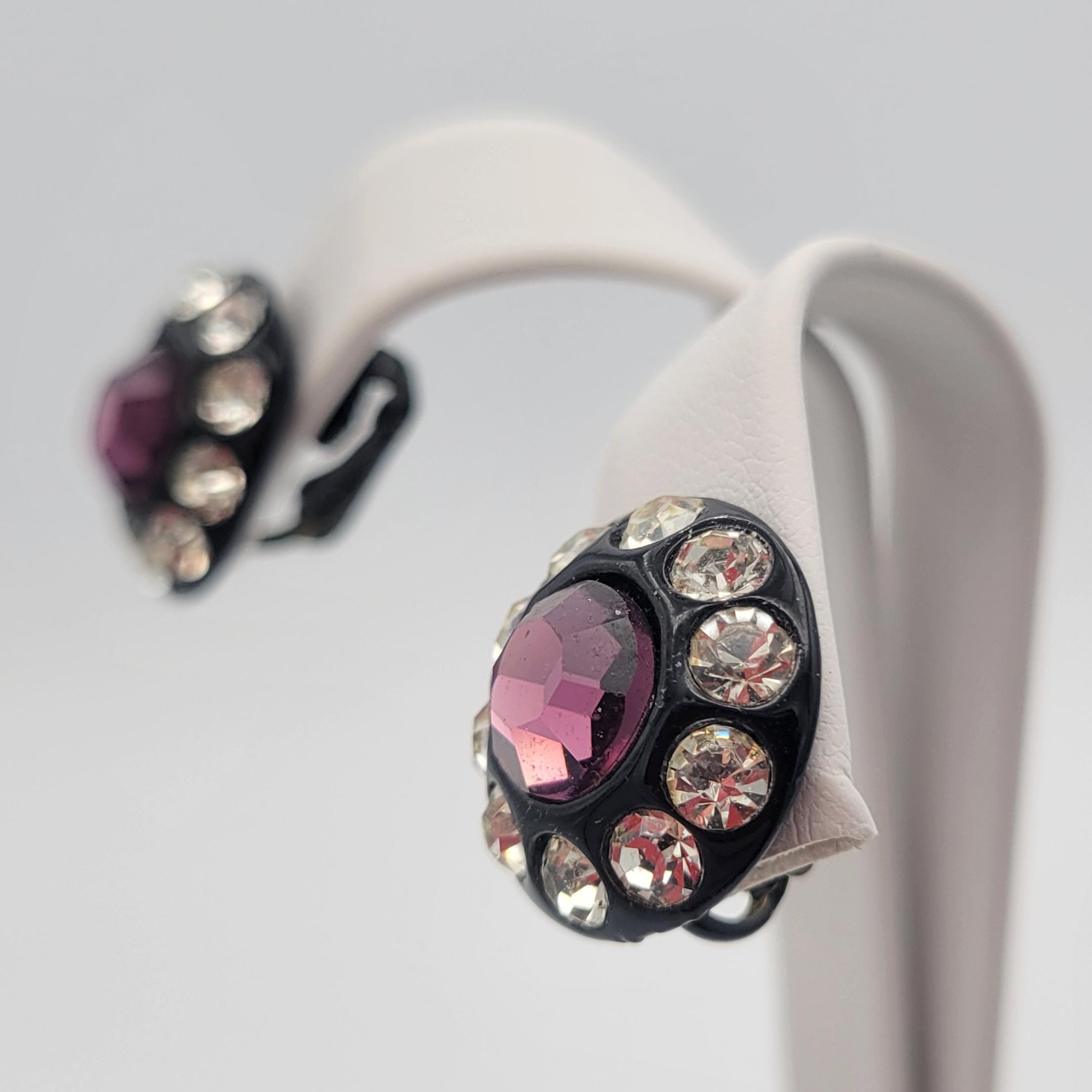 Vintage Black Gunmetal with Faux Amethyst & Clear Faceted Rhinestone Clip On Stud Earrings