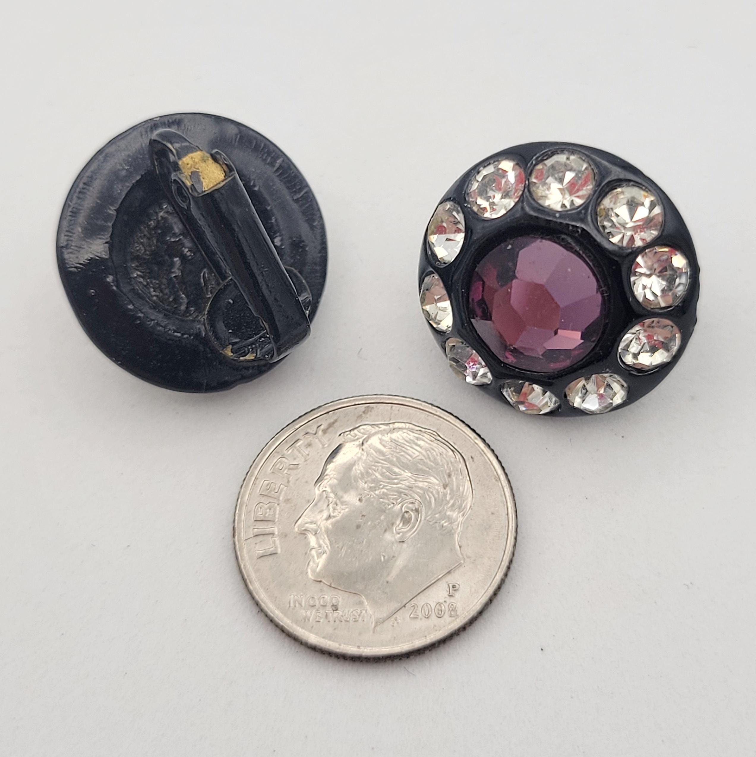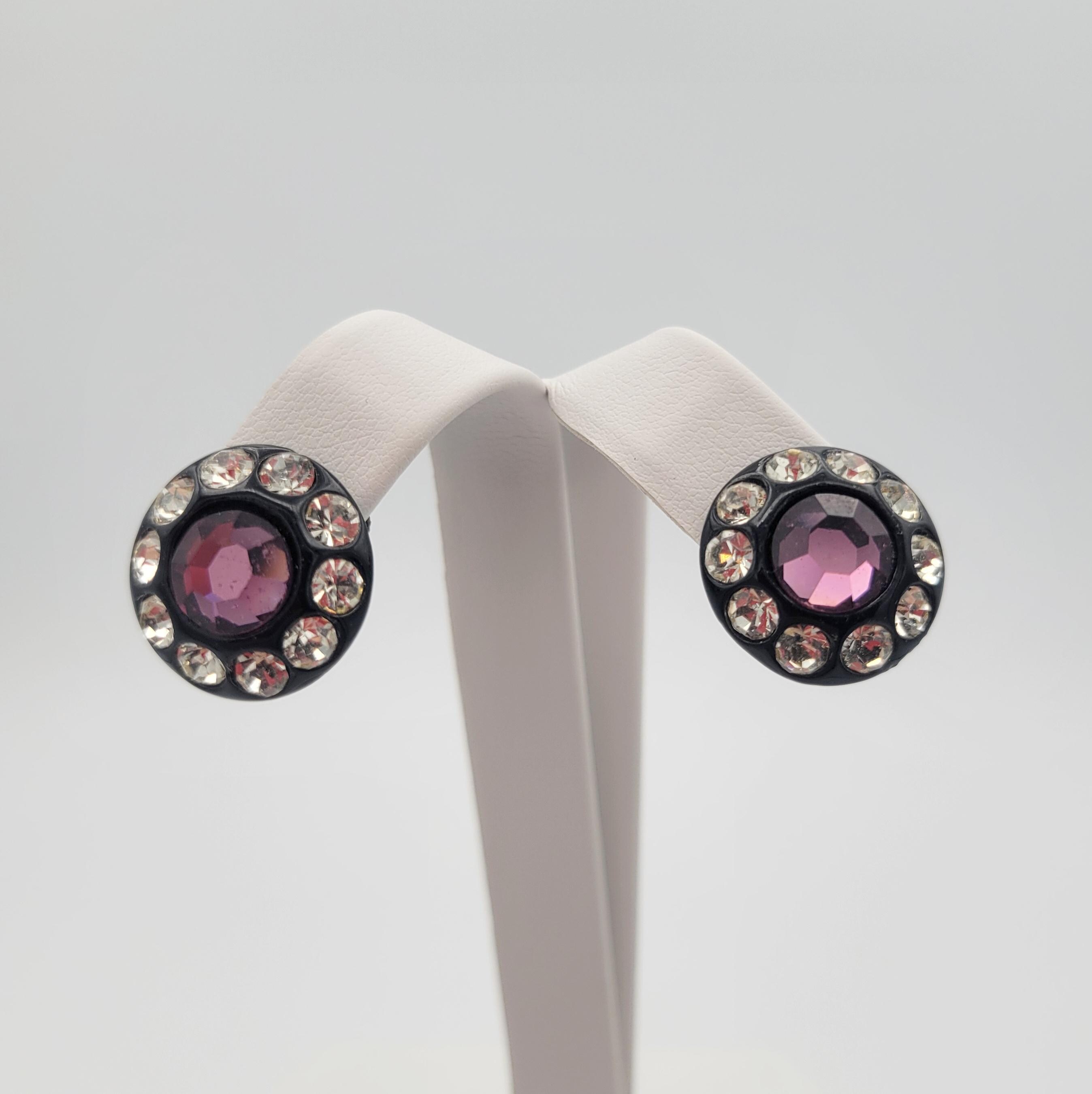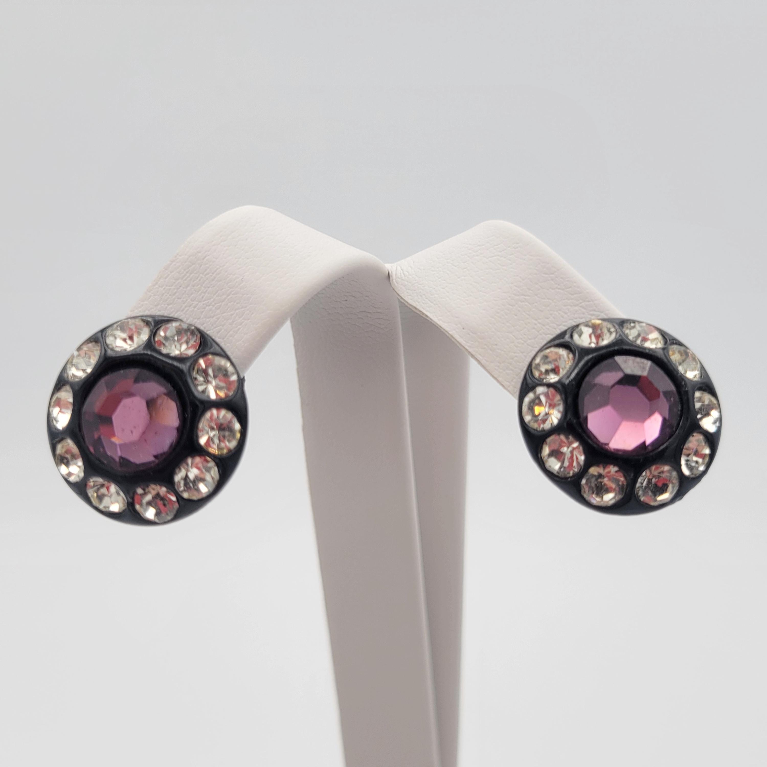 These chunky earrings will add some sparkle to your ensemble! The black gunmetal clips are affixed to a slightly convex button in the same metal. The button features a large round faceted faux amethyst stone in the center. The purple stone is surrounded by a halo of smaller clear rhinestones. These earrings are in excellent vintage condition with very little wear.