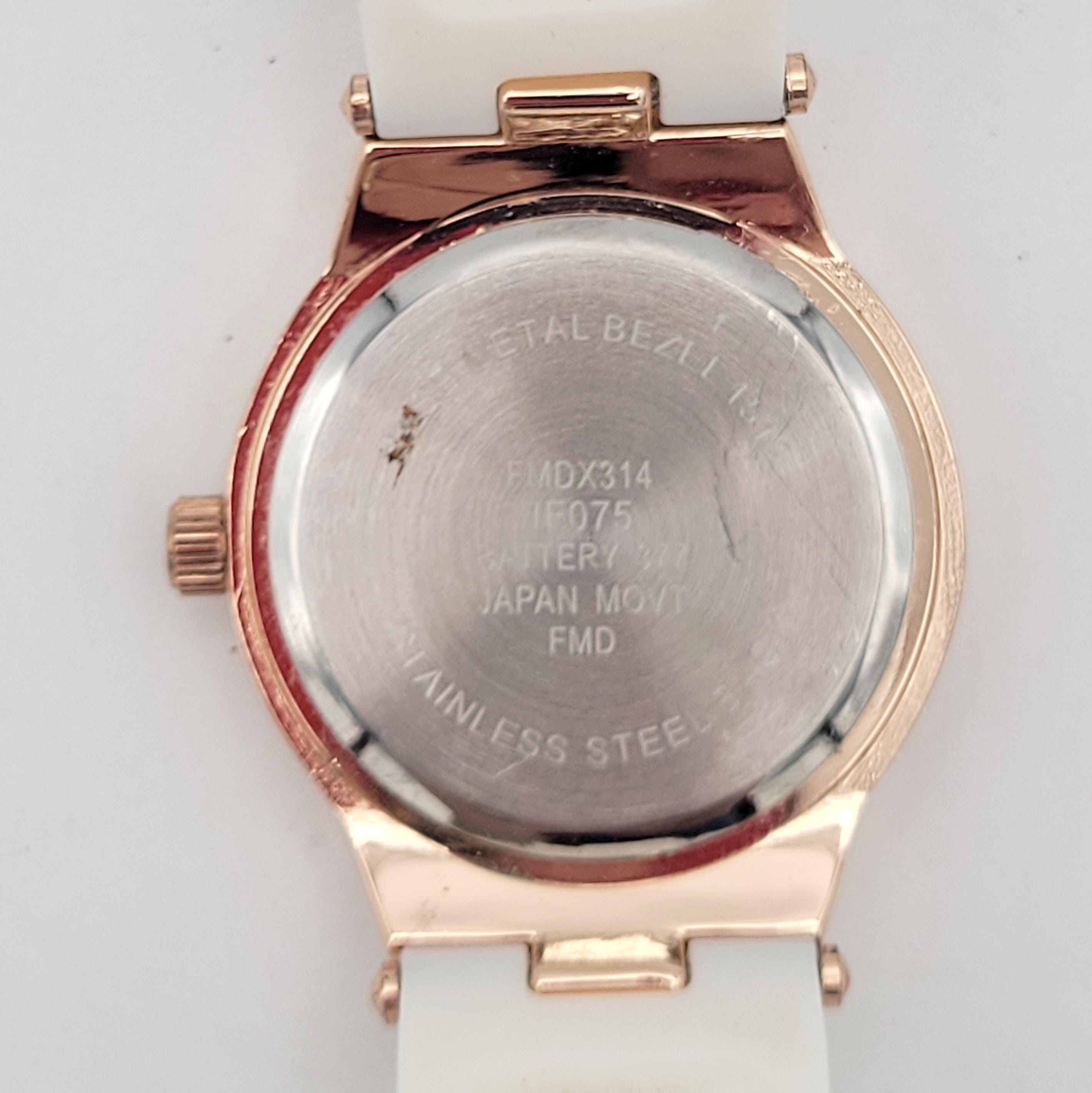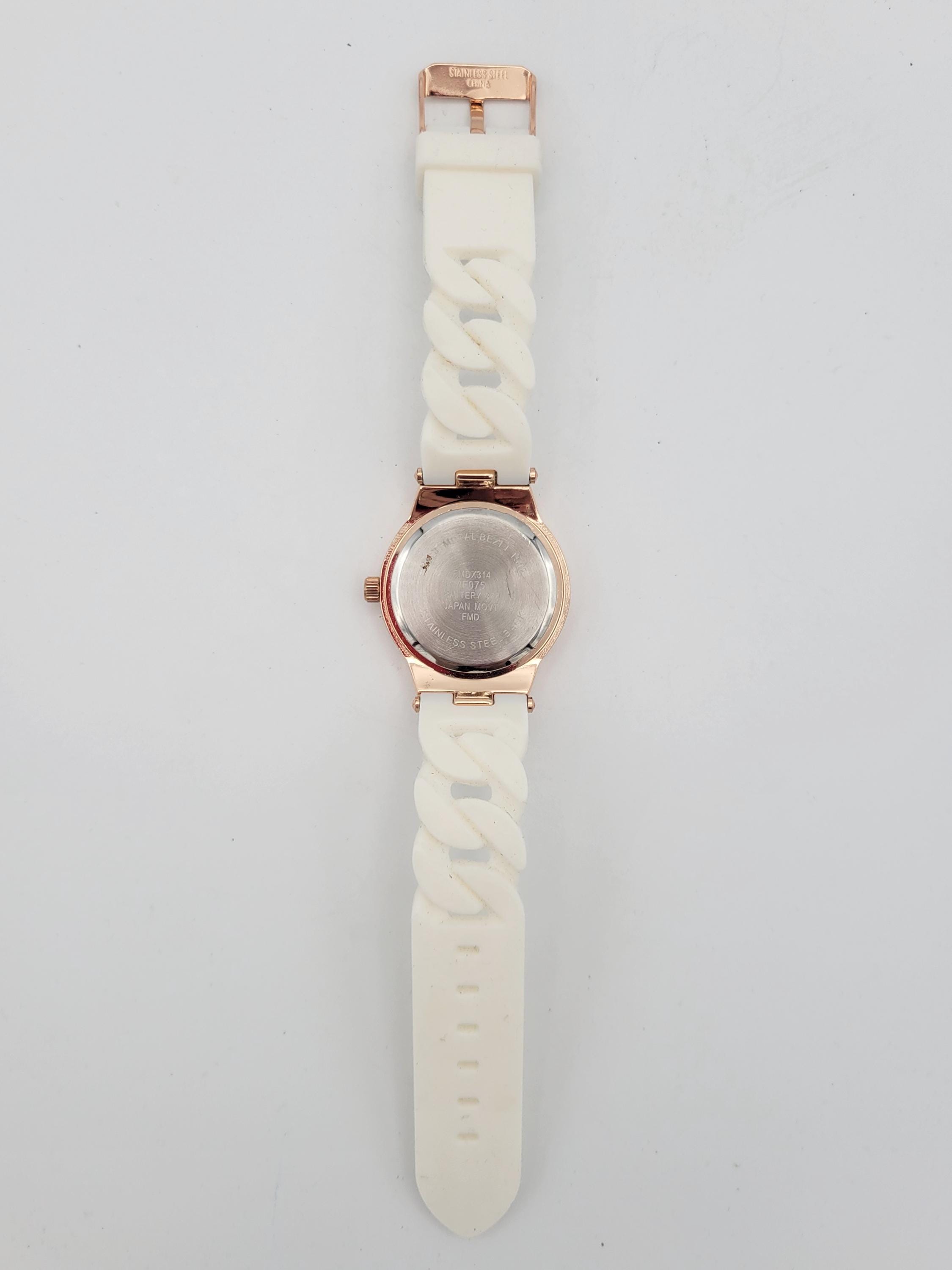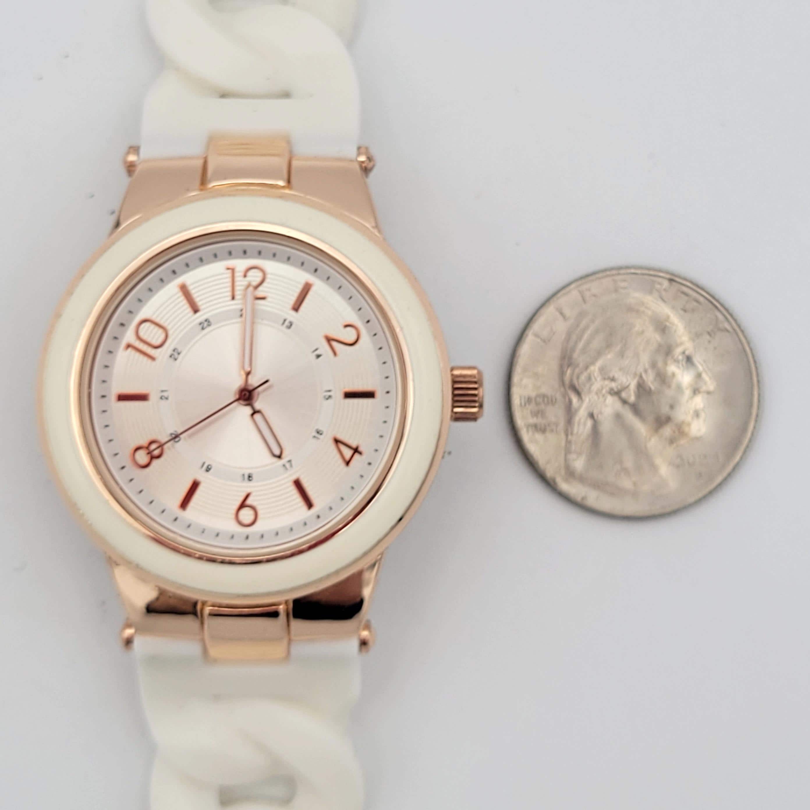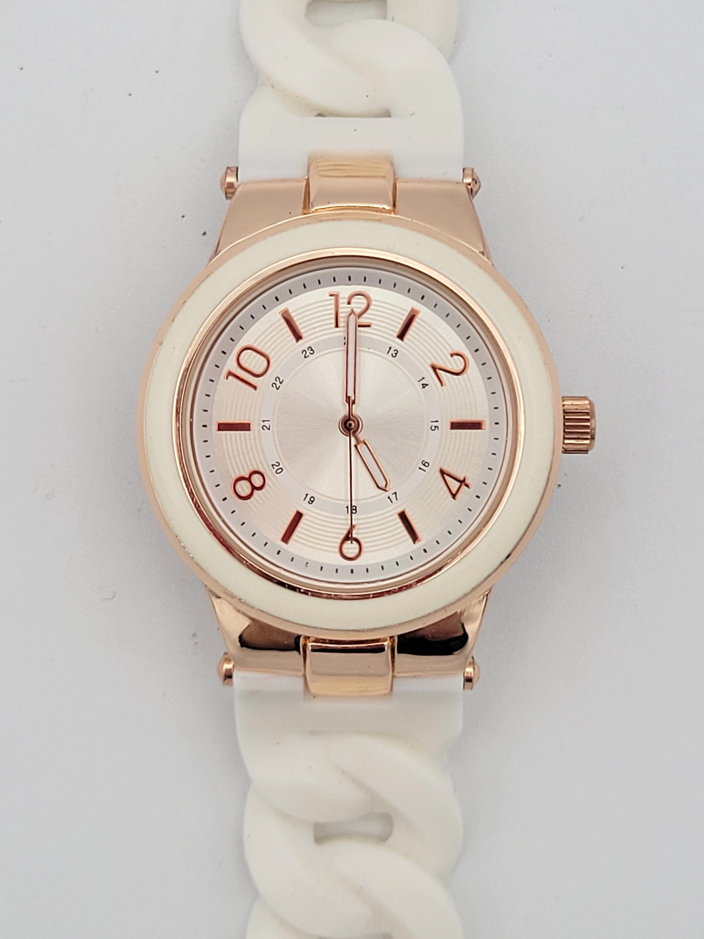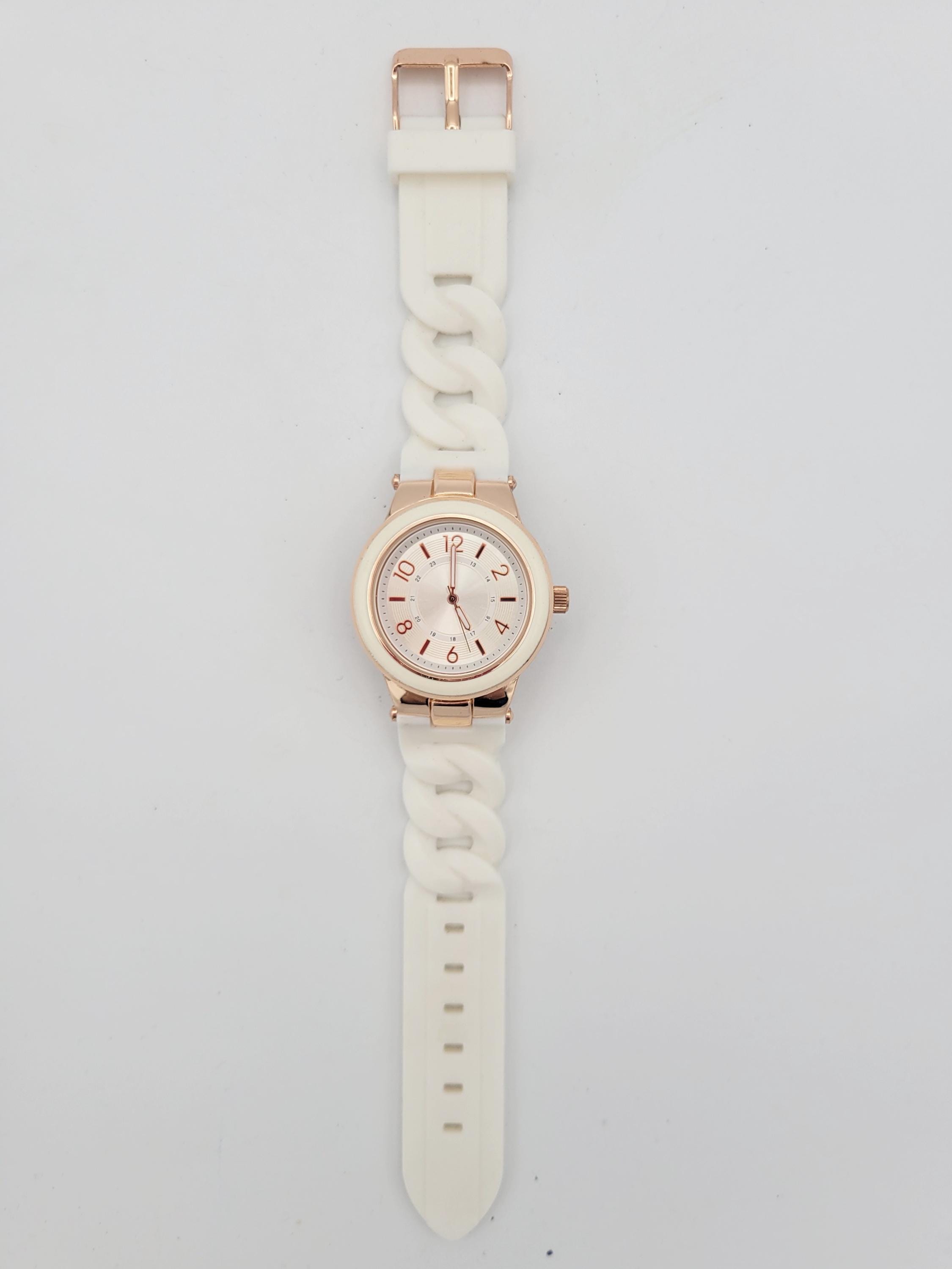 This classic watch makes a great everyday piece. The rose gold-tone circular case has a halo of white enamel, with a silver face & a rose gold-tone dial & hands. The band is white silicone that is make to look like a wide curb chain. The band secures with a rose gold-tone buckle. This watch is in excellent, nearly new condition. A NEW BATTERY was inserted & the watch works perfectly.