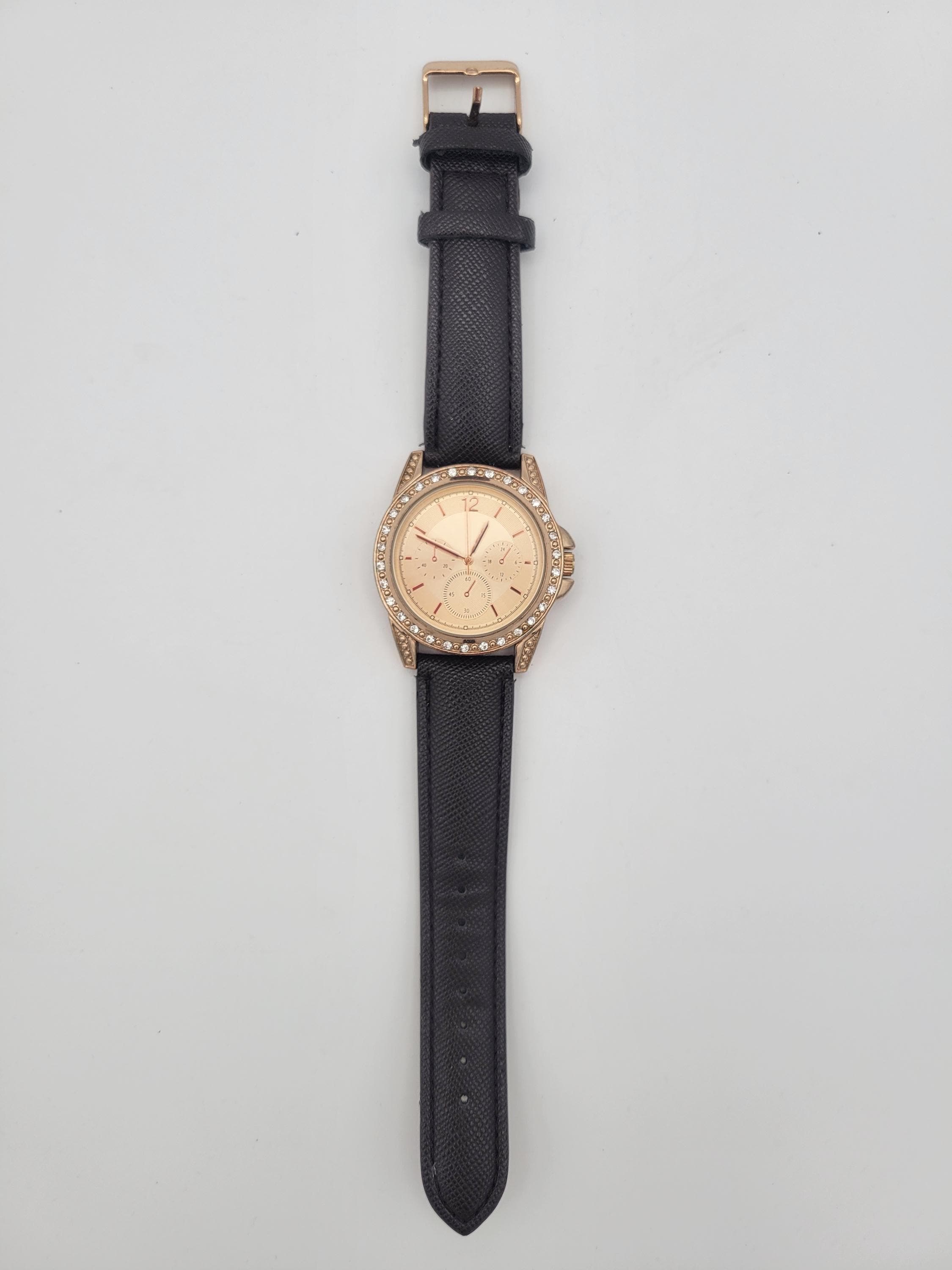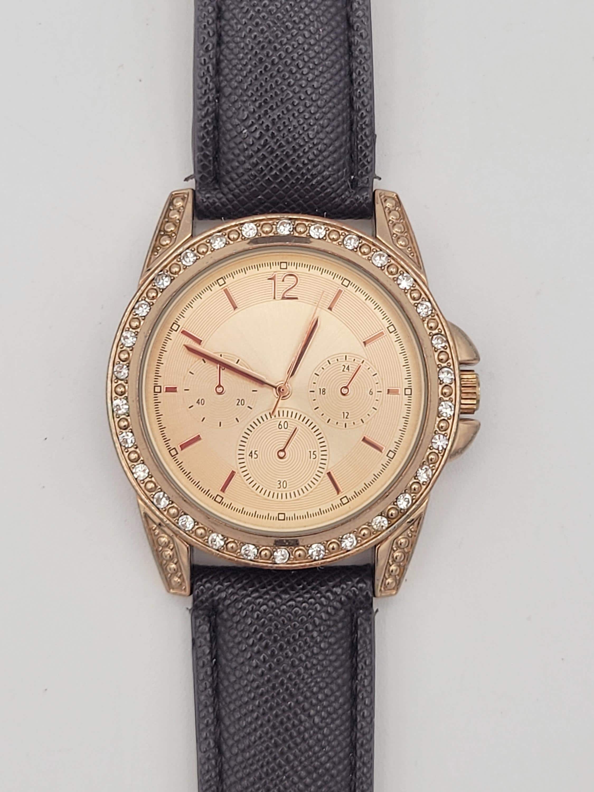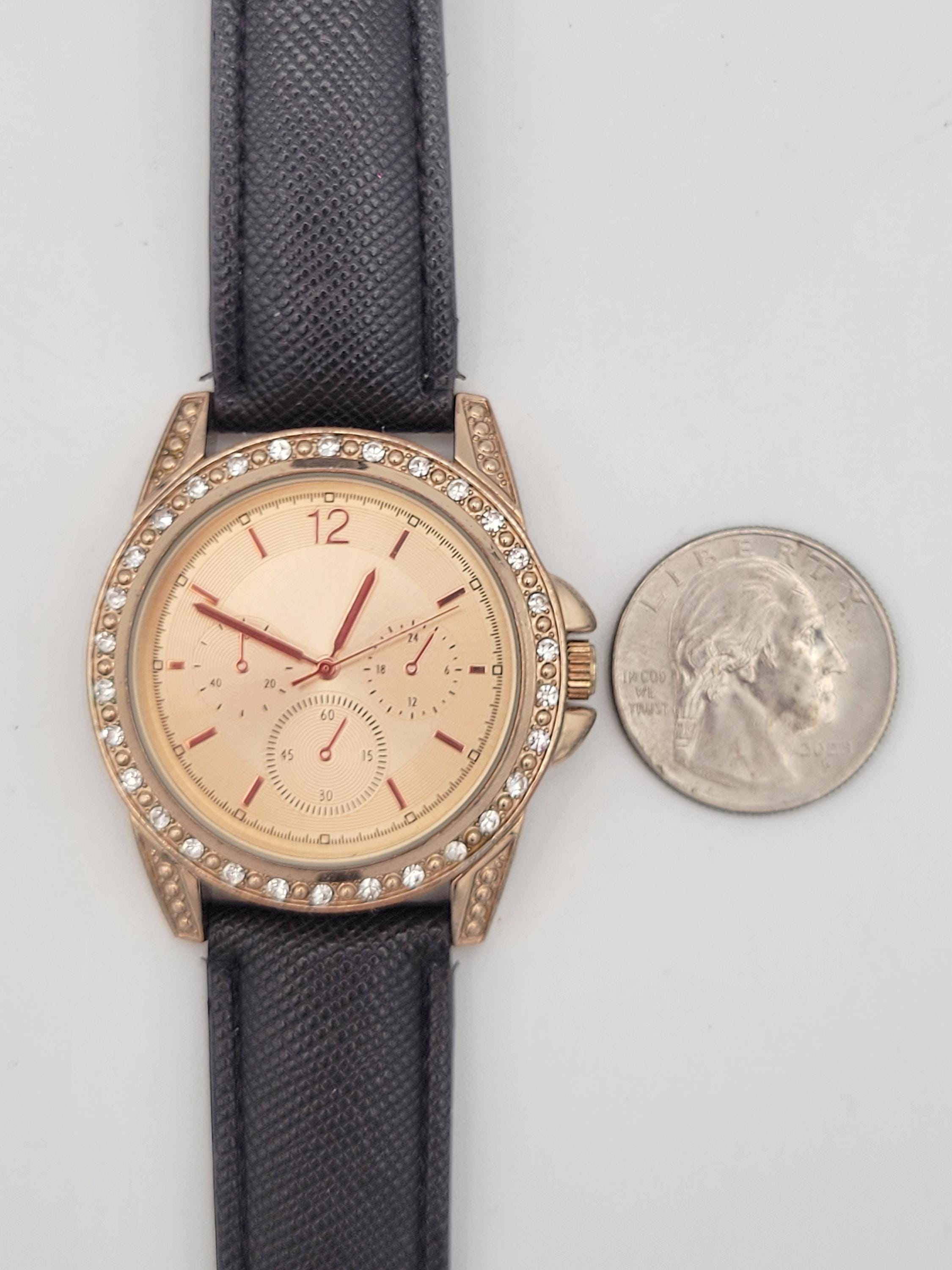 Vintage Rose Gold Tone Ladies Watch with Rhinestones, 3 Faux Chronographs & Faux Leather Band