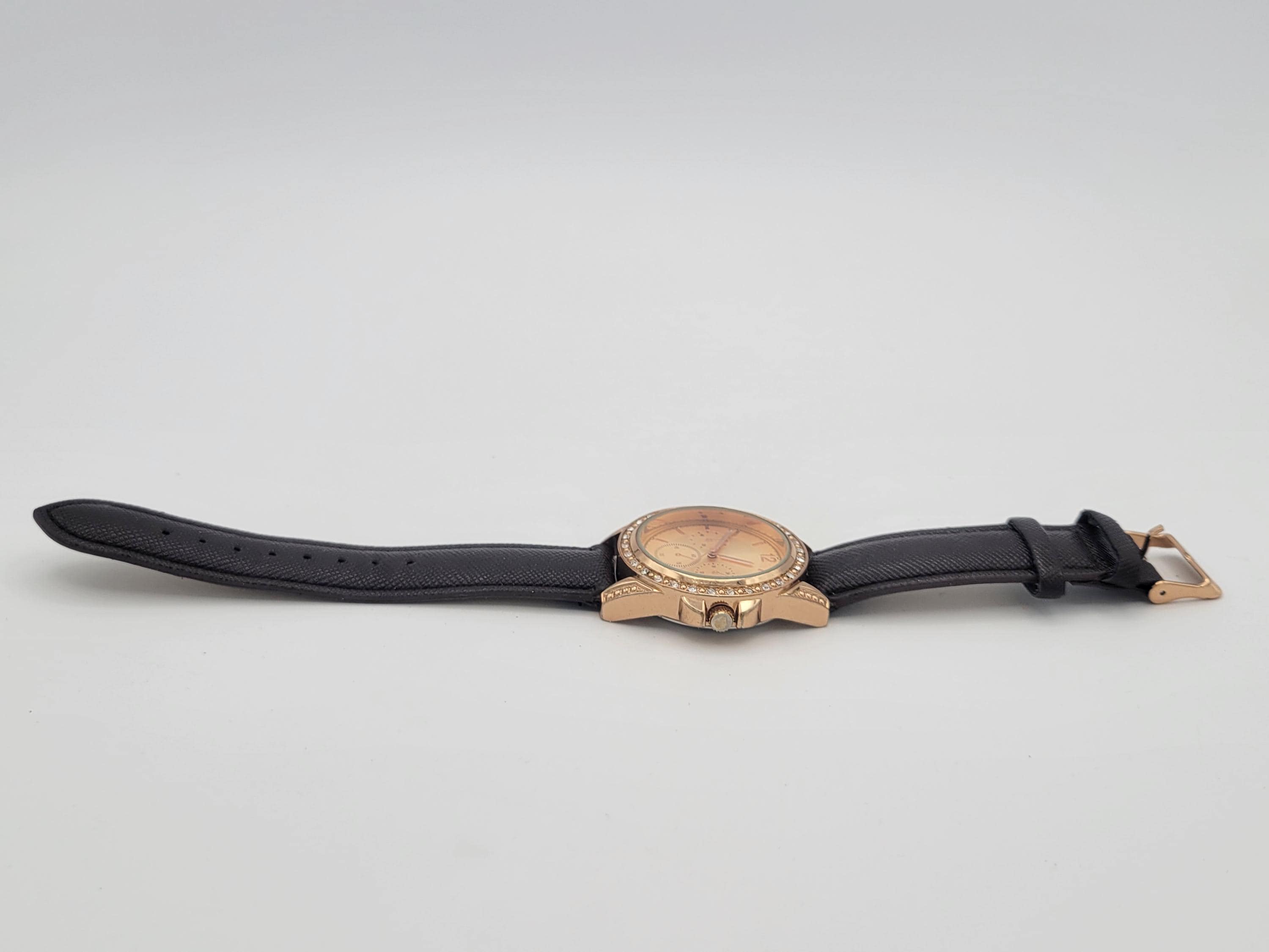 This watch makes an excellent statement piece. The all rose-gold tone watch features a large round case with a halo of rhinestones. The dial has minute markers & 3 faux chronographs.