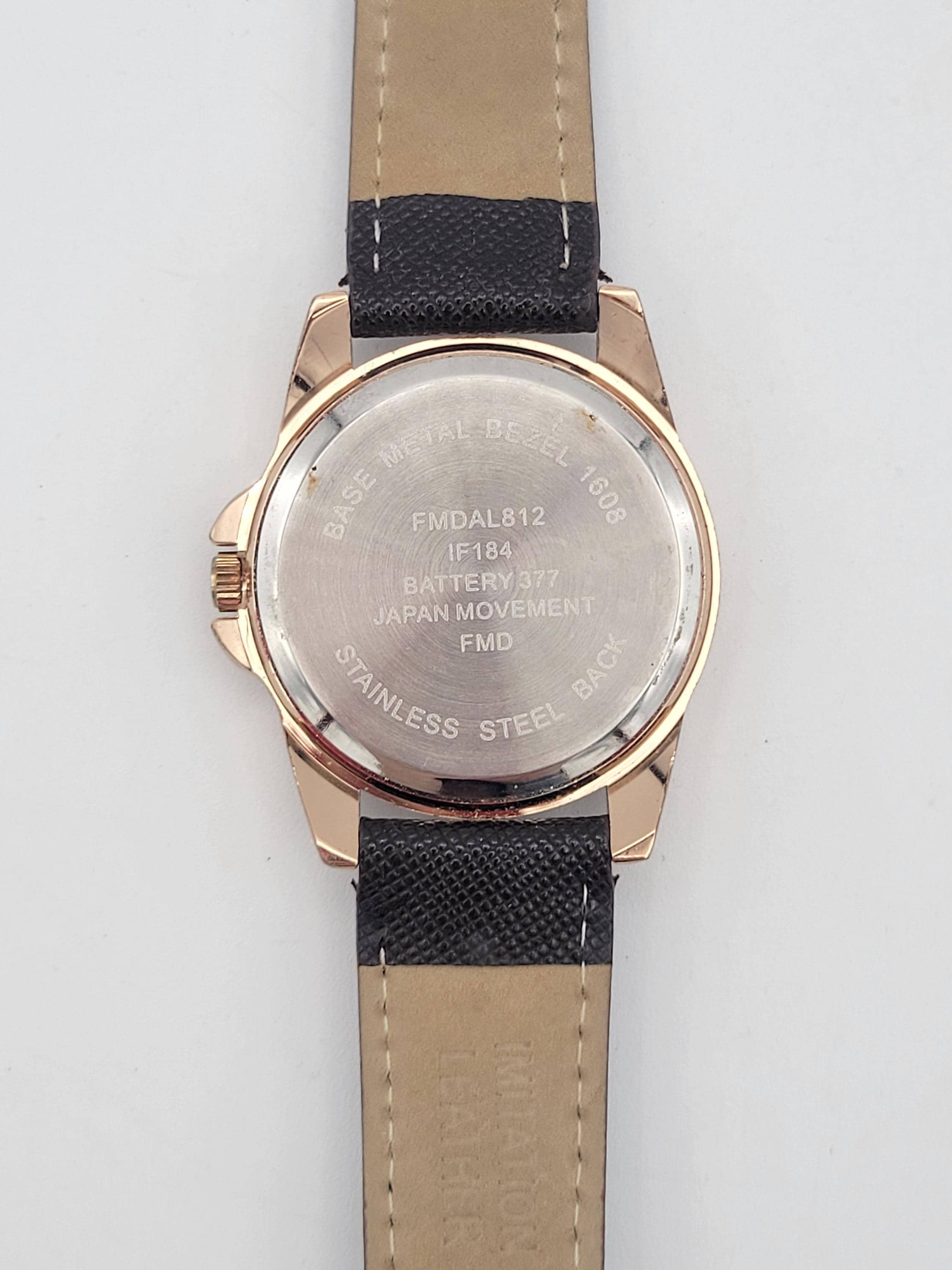 The brown faux leather band secures with a rose gold-tone buckle. This watch is in excellent vintage condition with very little wear. A NEW BATTERY was inserted & the watch works perfectly.