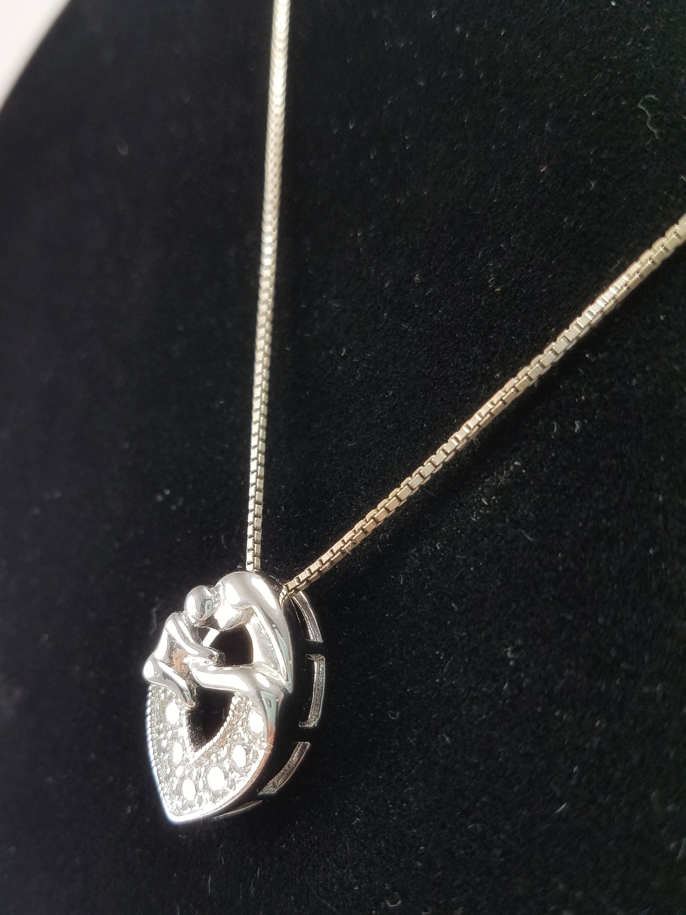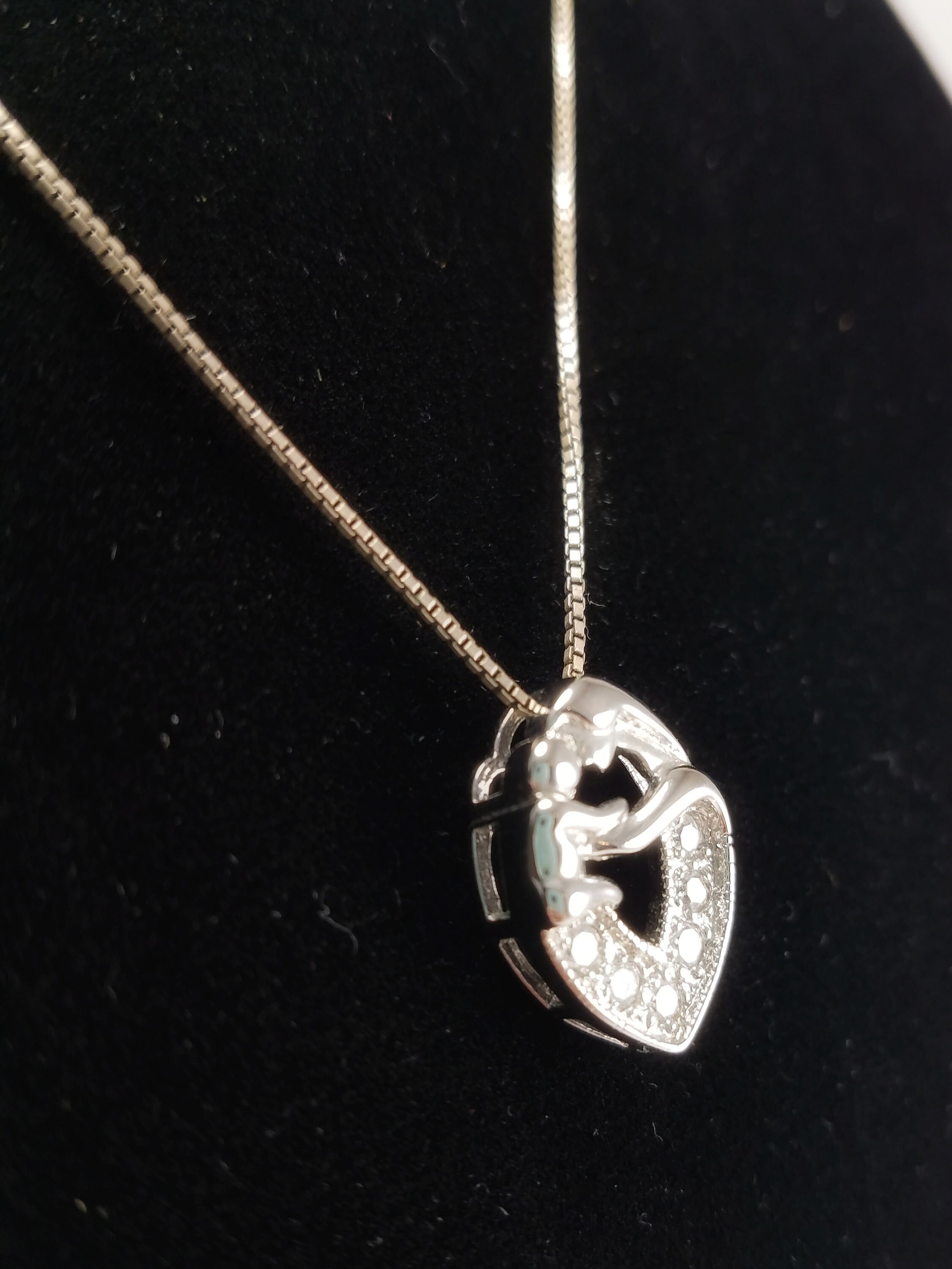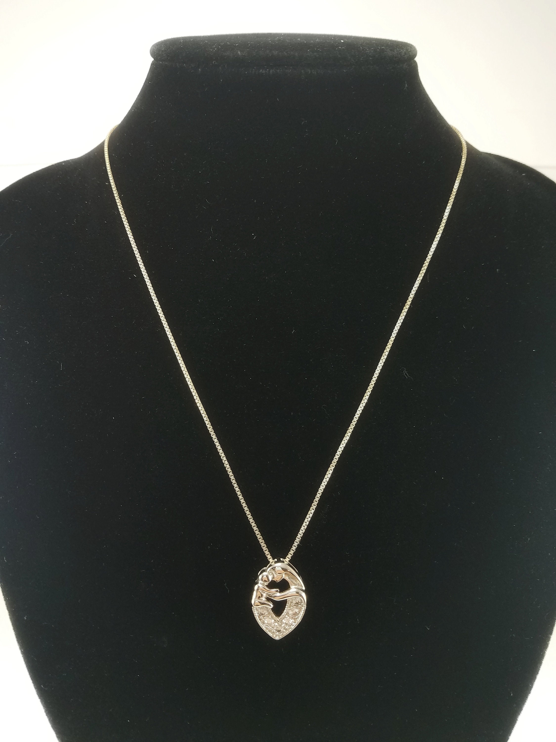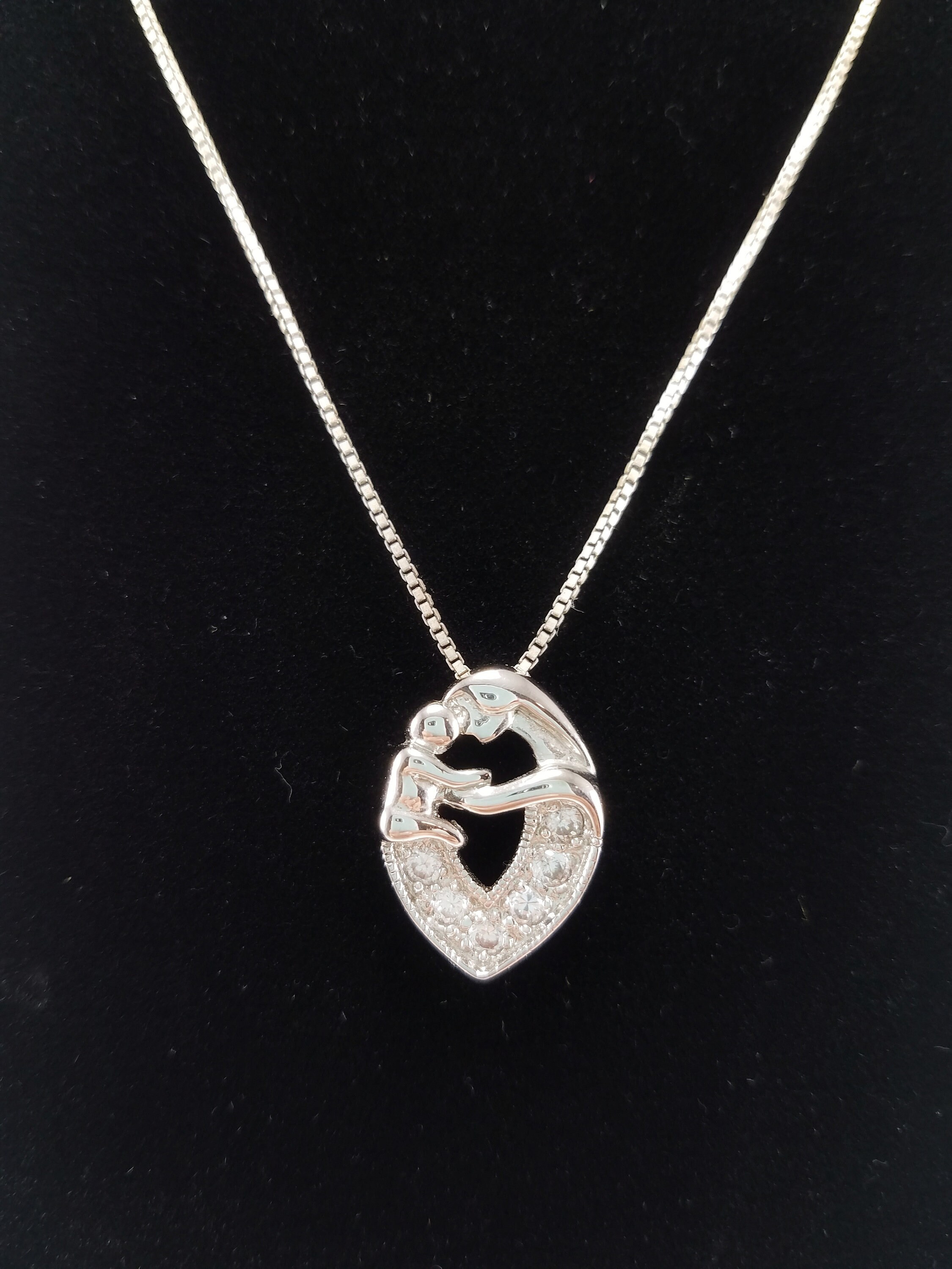 This bright & shiny pendant is a great gift for a mom in your life. The sterling silver box chain is secured with a spring-ring clasp. The chain holds a silver-plated oval-shaped slider pendant. The pendant features a mother & child & 6 clear round cubic zirconia stones. The necklace is in great condition, but the chain does need cleaning. The pendant is brand new.