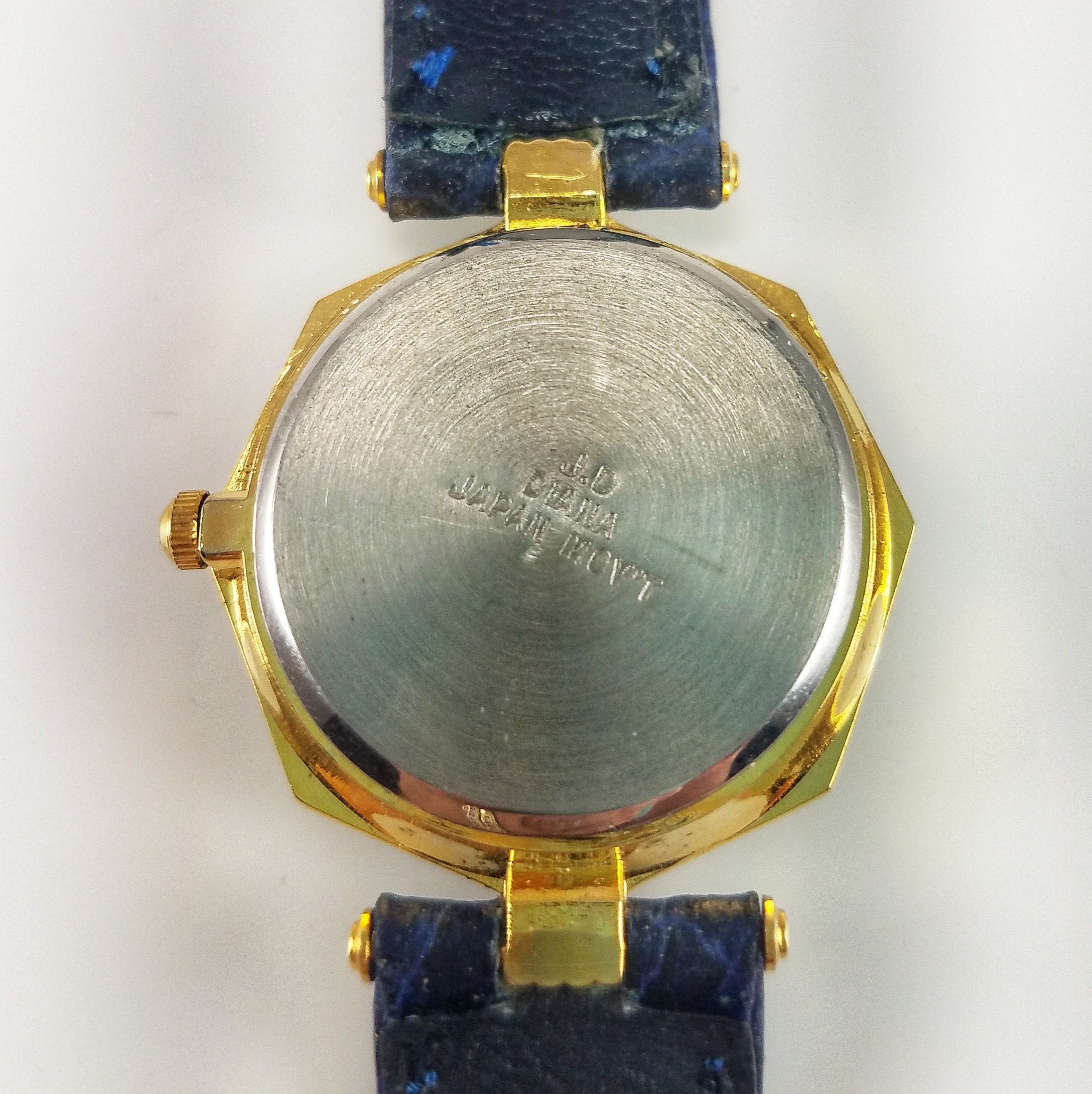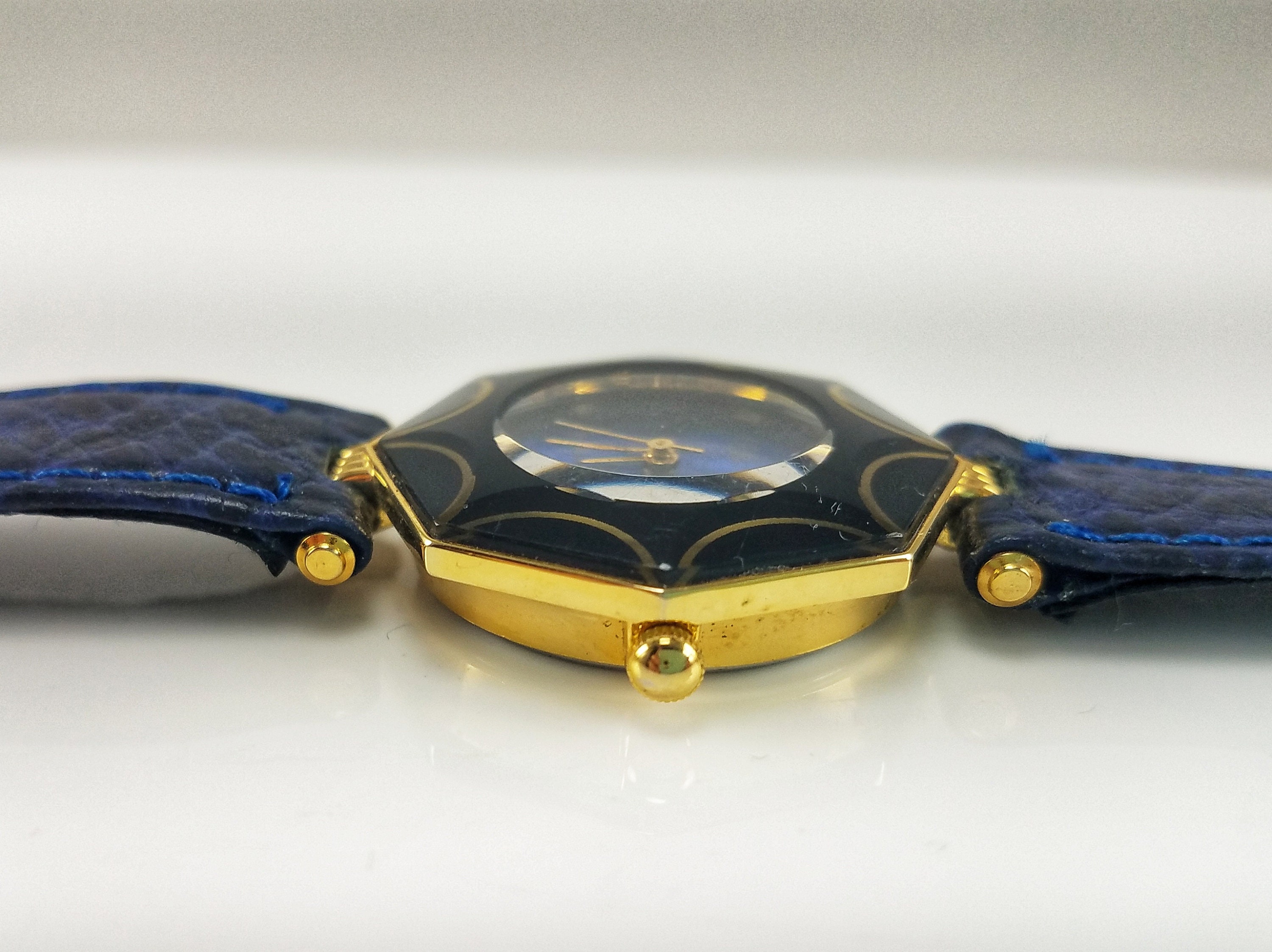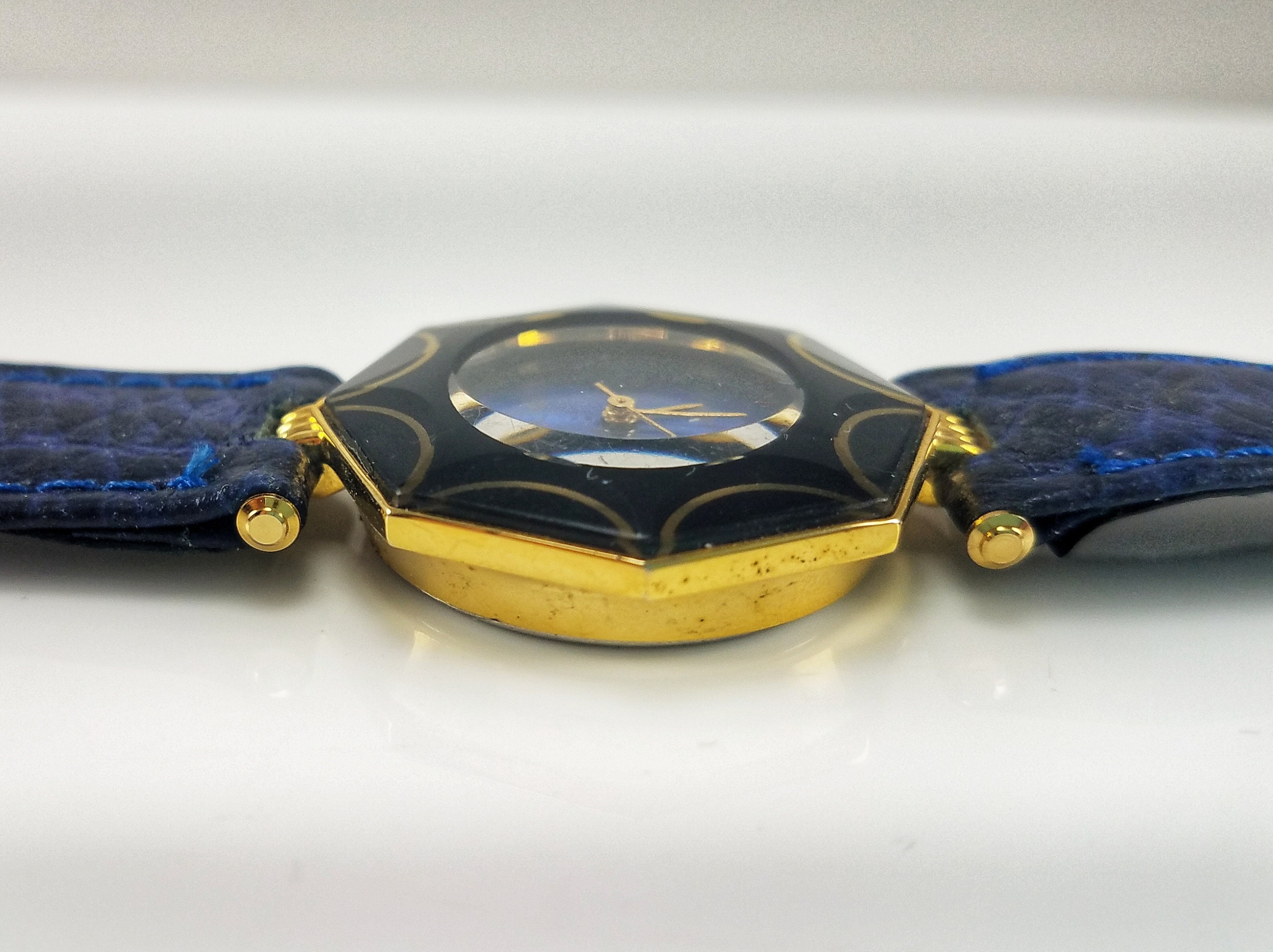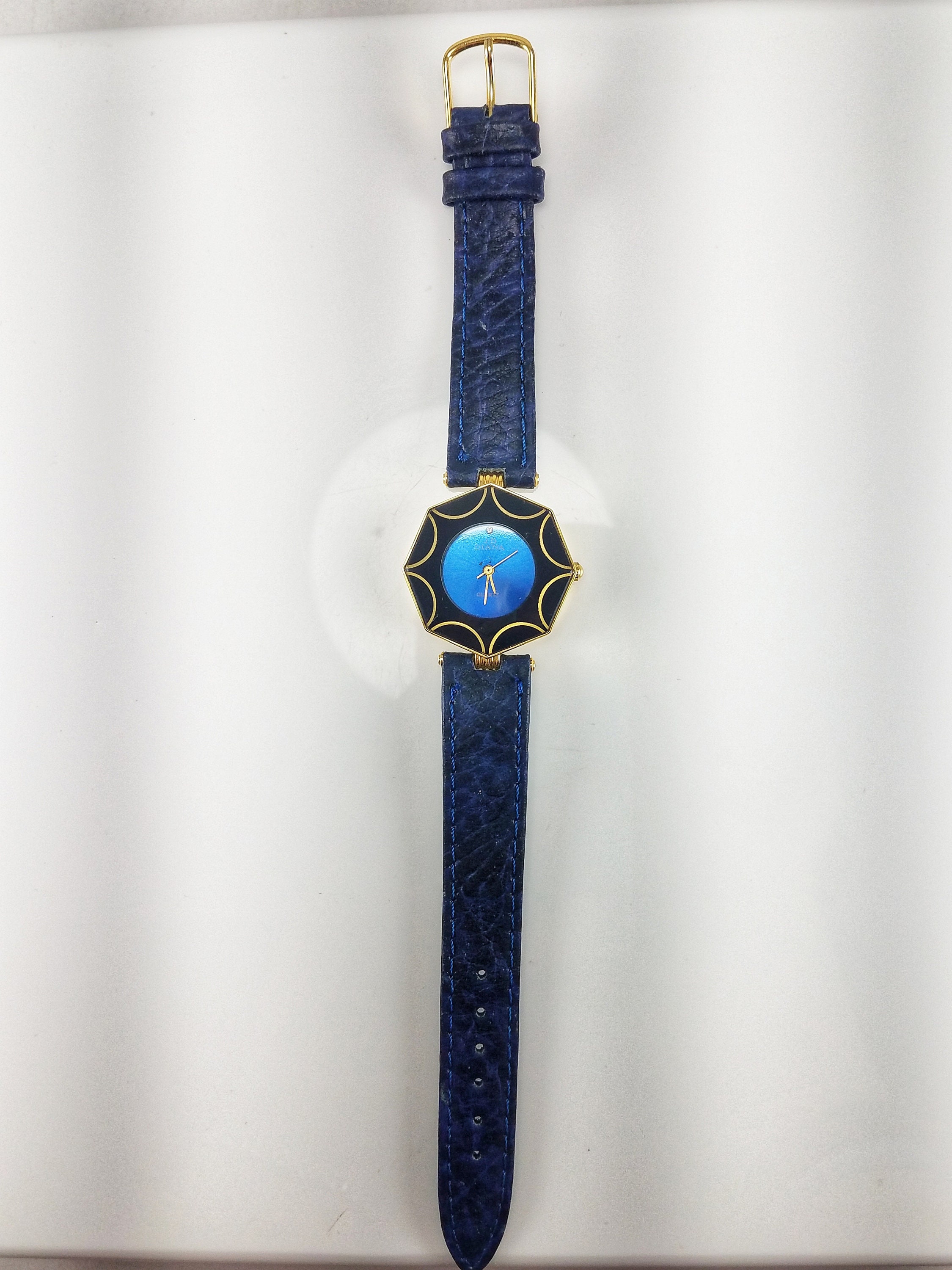 This beautiful makes a great everyday piece or is perfect to add a pop of blue to your ensemble. The gold-tone case is octagonal & features a cobalt blue face, gold-tone hands & a black & gold geometric design around the face. The band is blue faux leather with a gold-tone buckle. The piece is in great condition with very little wear on the case & the band. There are some minor surface scratches on the crystal. A NEW battery was inserted in July of 2020 & the watch functions perfectly.