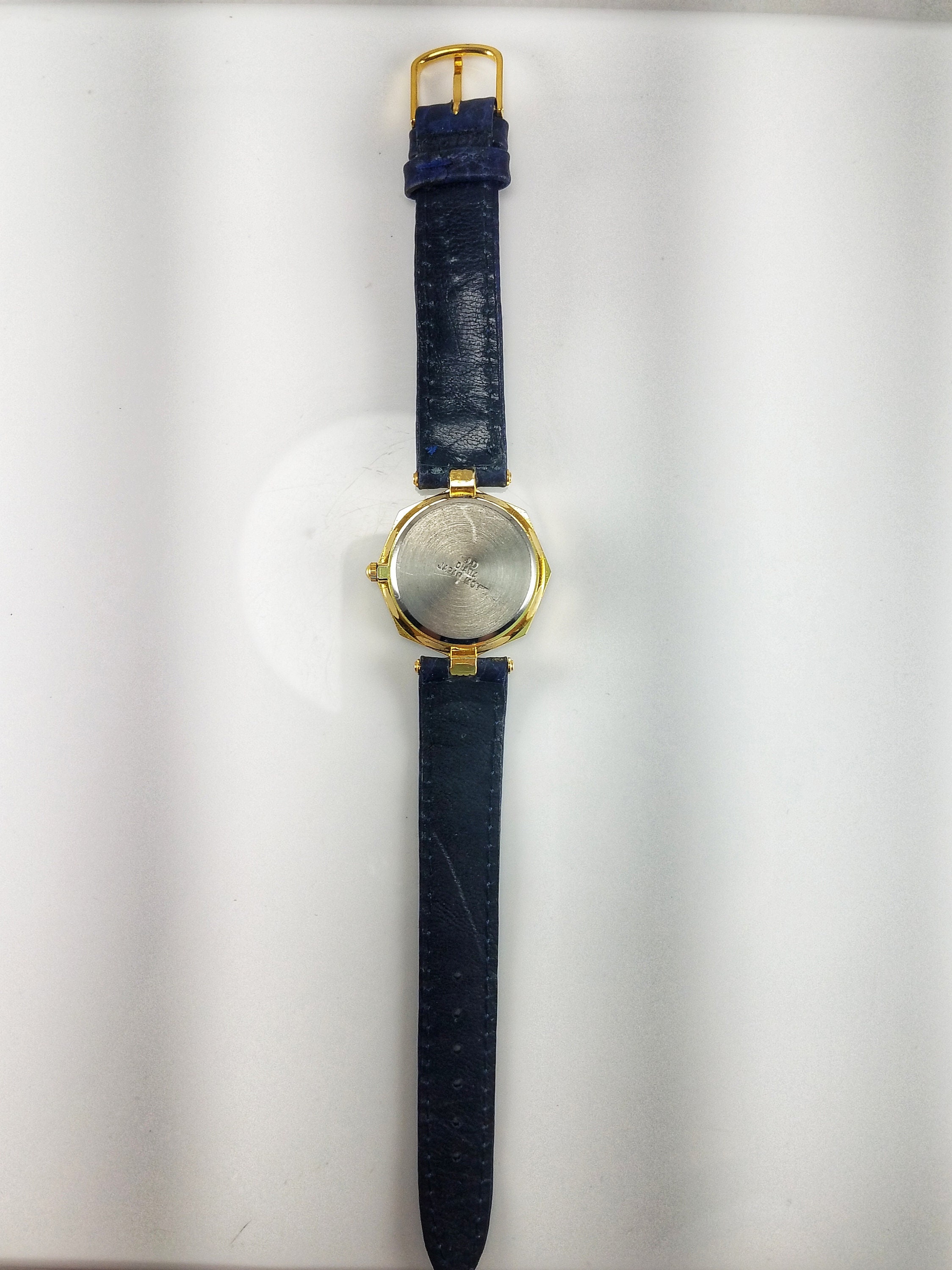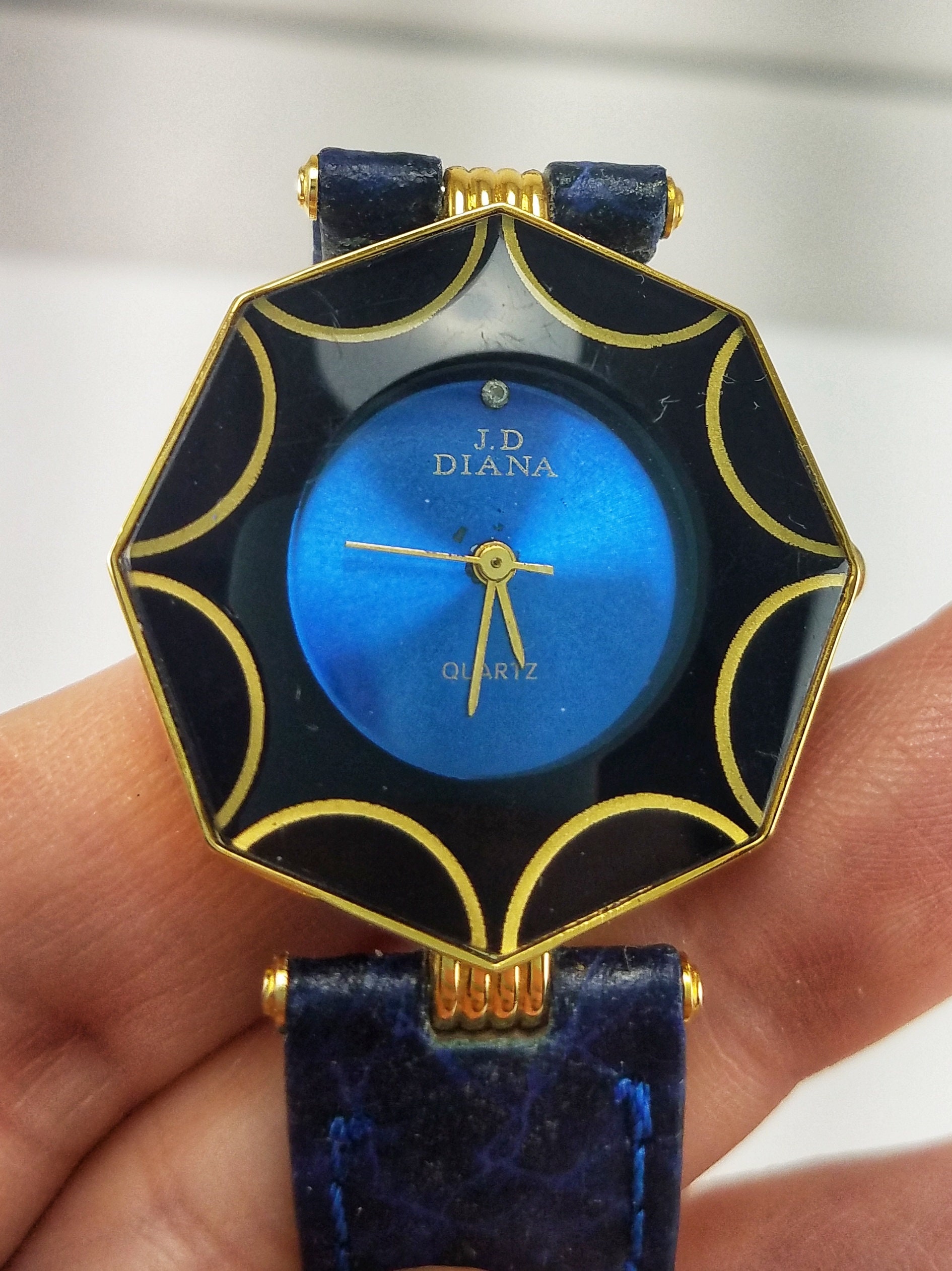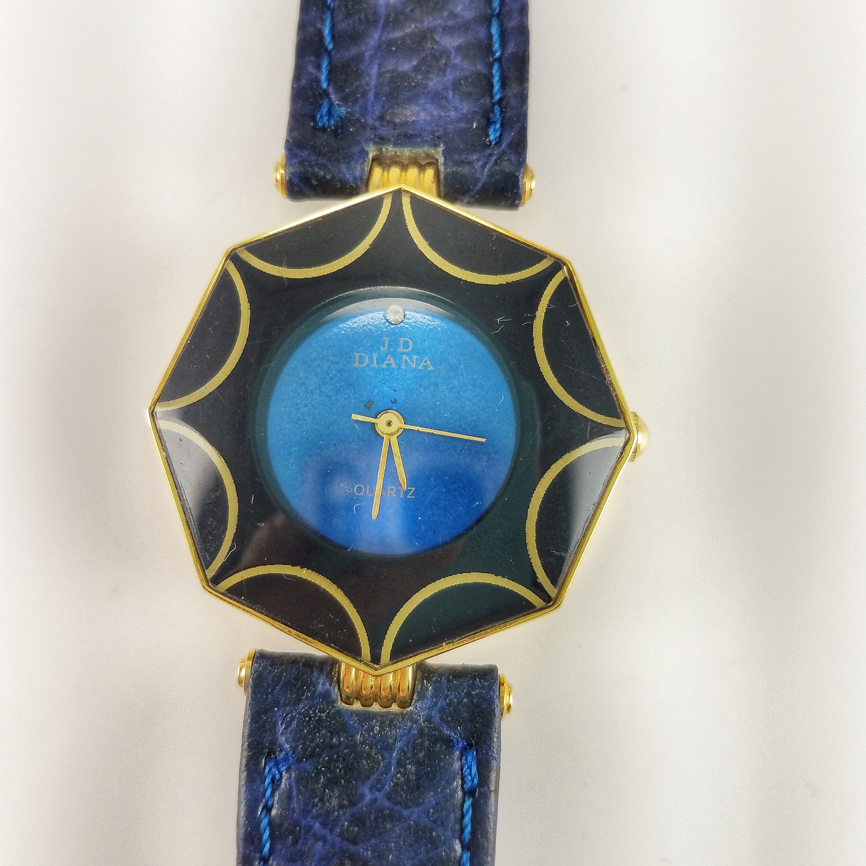 Vintage JD Diana Cobalt Blue, Black & Gold Tone Ladies Wrist Watch with Faux Leather Band