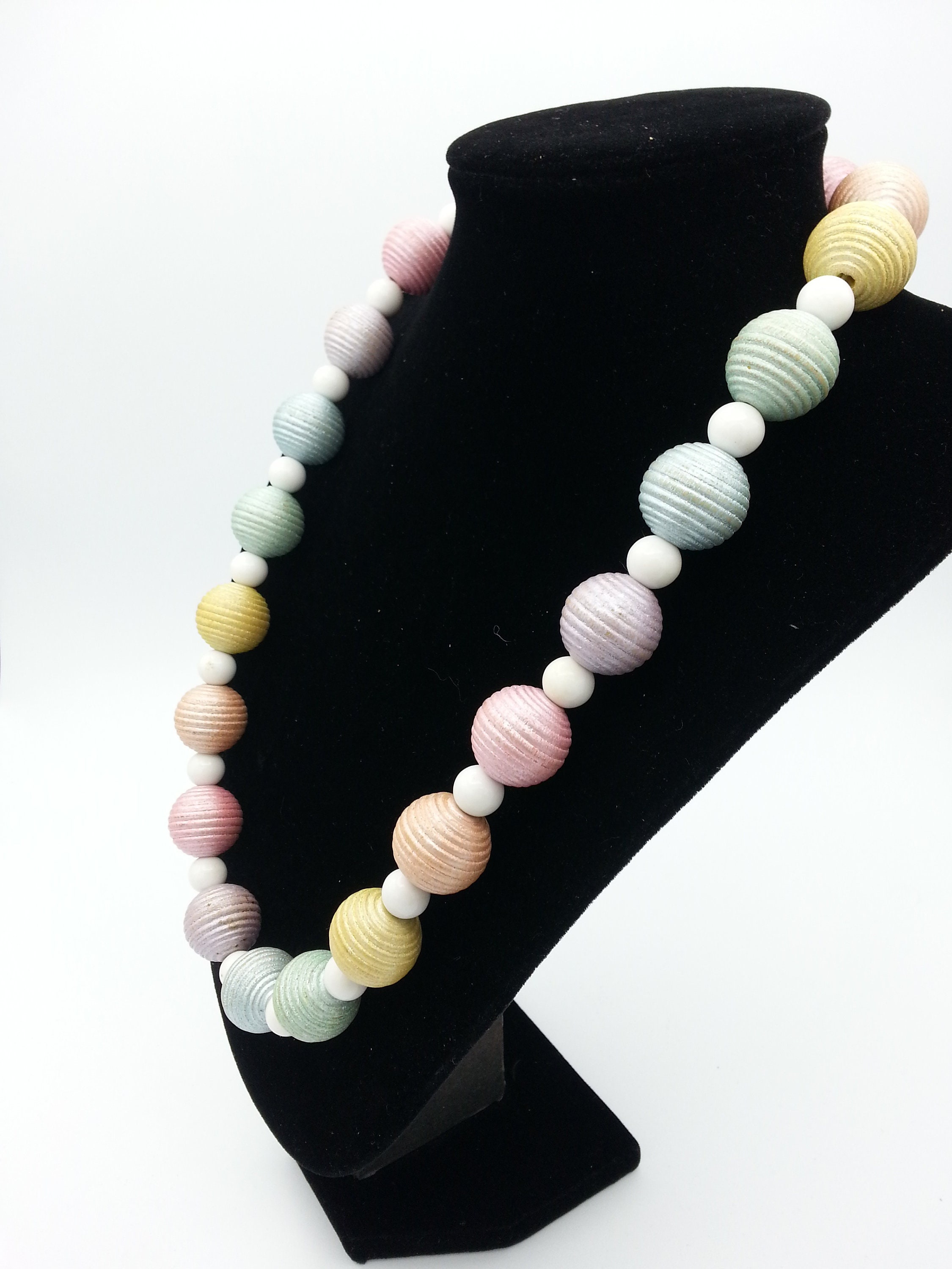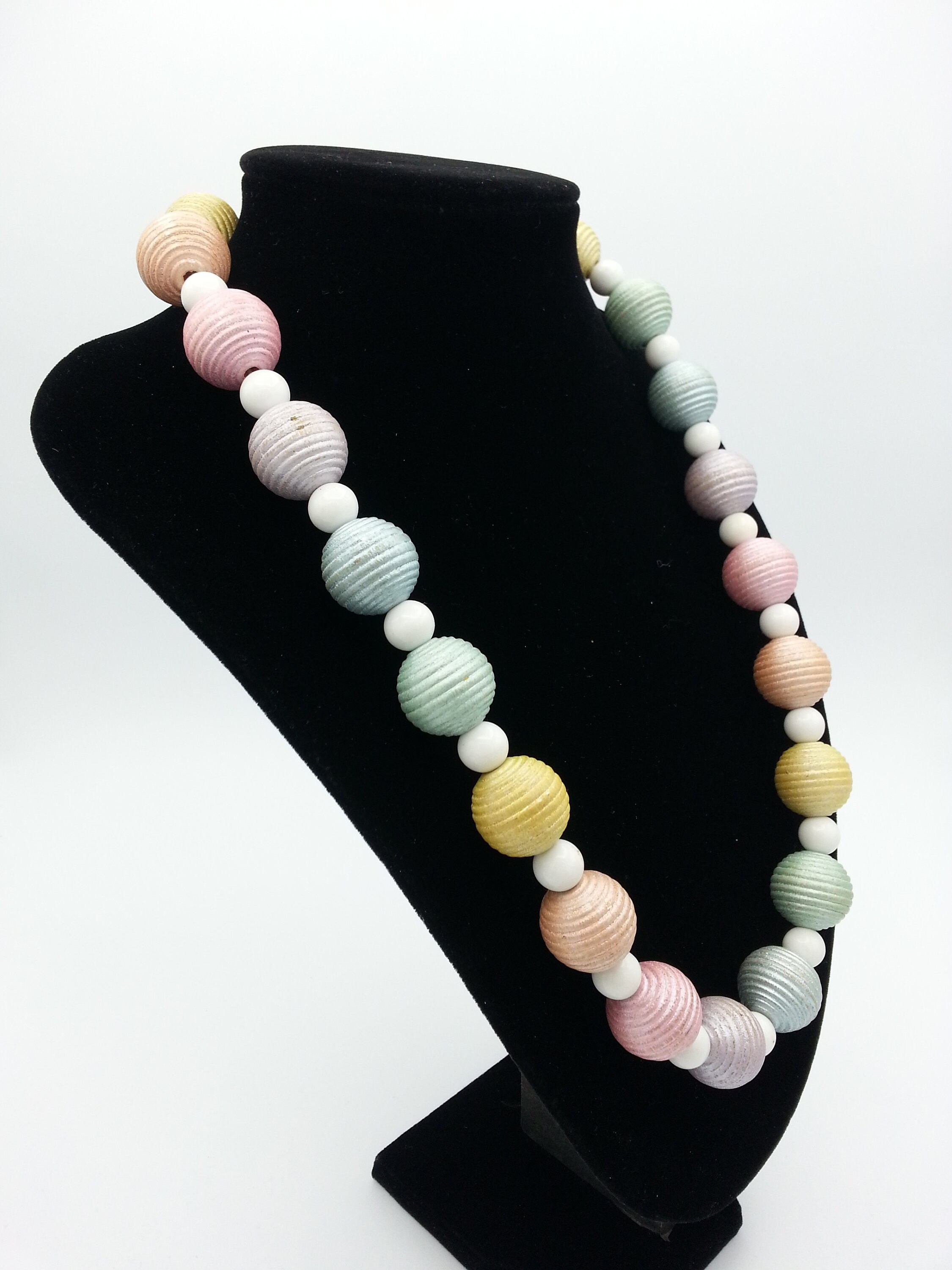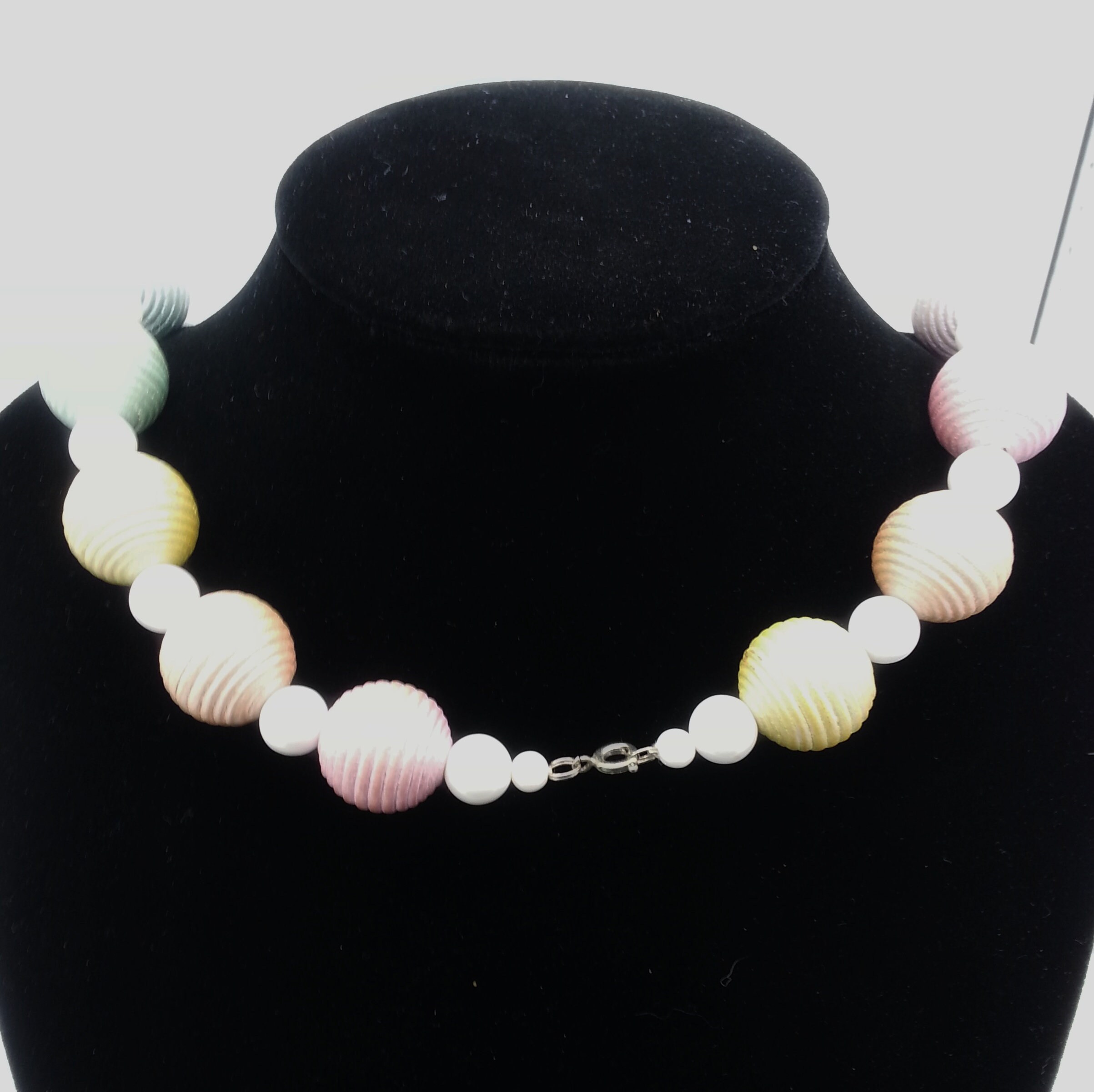 This chunky necklace is perfect for spring! A single strand of large wooden beads & smaller plastic round beads make up this pretty piece. The large beads are spherical, 3/4 of an inch in diameter & grooved for added texture. They are in a rainbow of pastel colors. Each wooden bead is separated by a smaller white plastic bead. The necklace is secured with a silver-tone spring-ring clasp. This necklace is in good vintage condition. There are a few areas on the wooden beads where the paint has chipped off & the natural wood color is showing through. The piece does need cleaning as well.